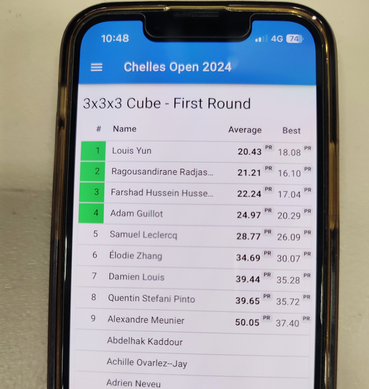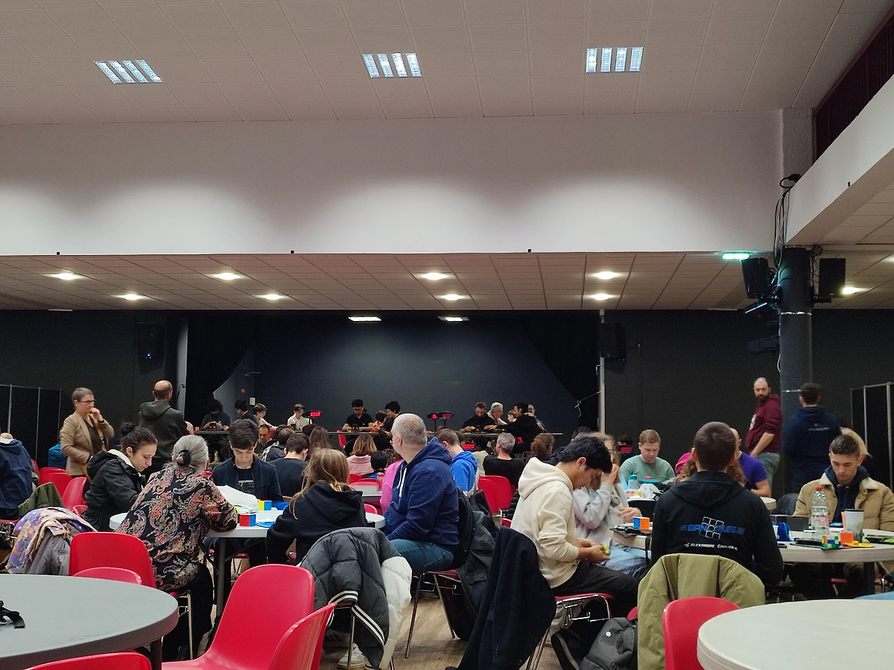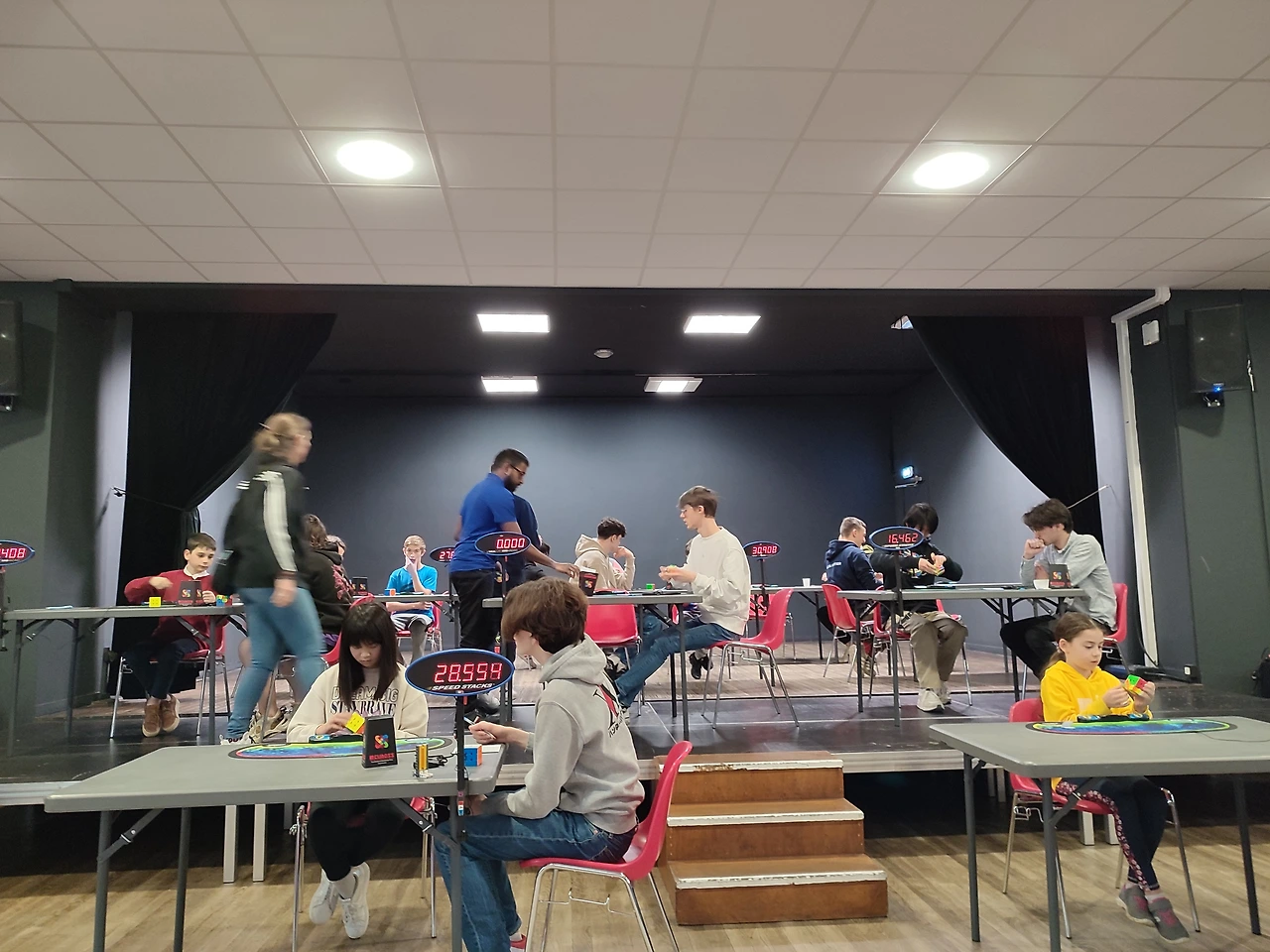10살쯤 되어 보이는 중국 남자아이가 심사위원 자리에 있었는데... 상황을 보니 경기에 참석하는 사람들이 심사위원도 하고 경기 진행도 돕고 경기 참가자가 테이블에 아직 앉지 않았을 땐 본인들도 큐브 연습을 하고 있었다.
