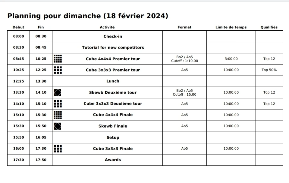 큐브 종류마다 경기 시간이 다르며 한 경기 접수비는 5유로다.