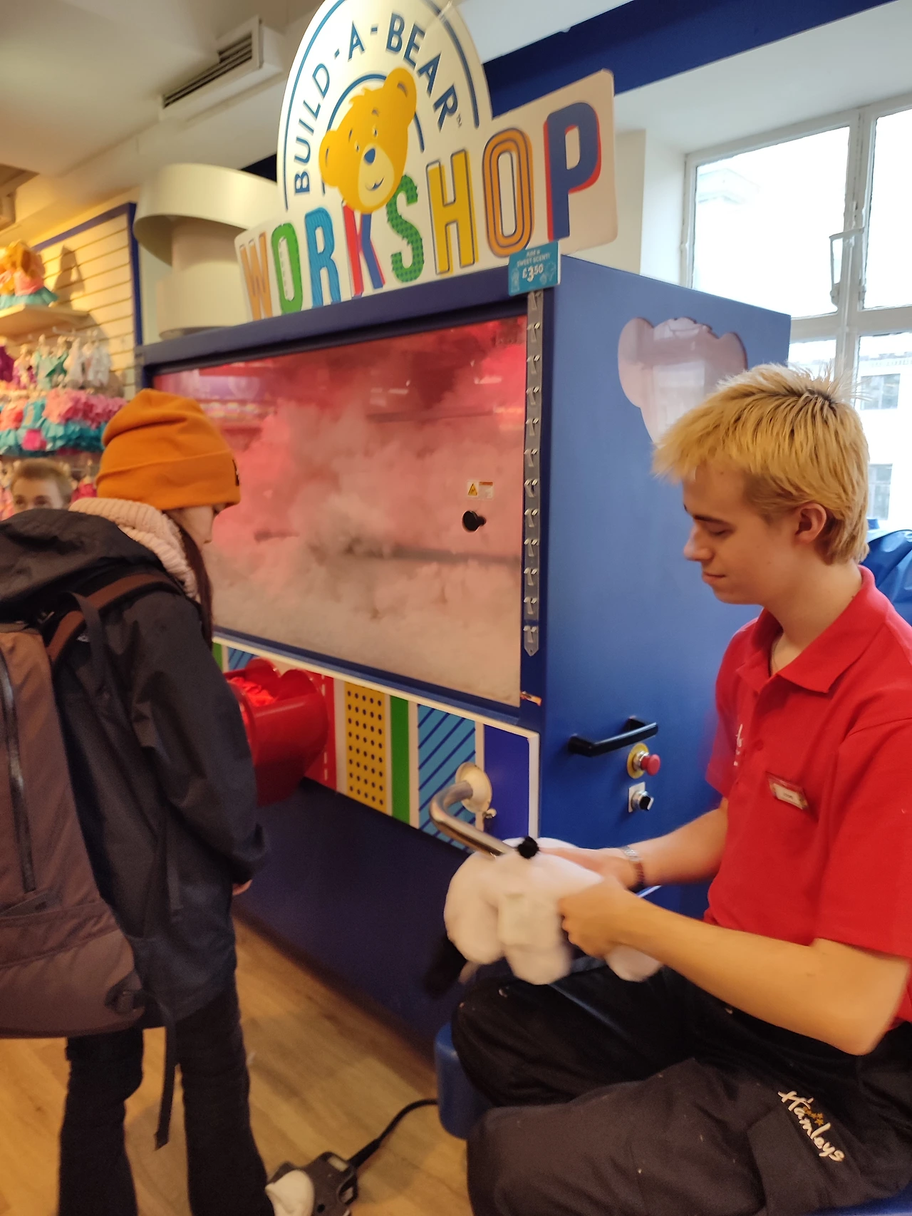 우선 인형을 하나 고르고, 인형 안에 소리를 넣을지 선택, 딸아이는 자기 목소리로 '사랑해'를 녹음했다. 아이가 페달을 밟으면 직원이 솜을 인형 안에 채워준다. 물론 직원이 물어본다.