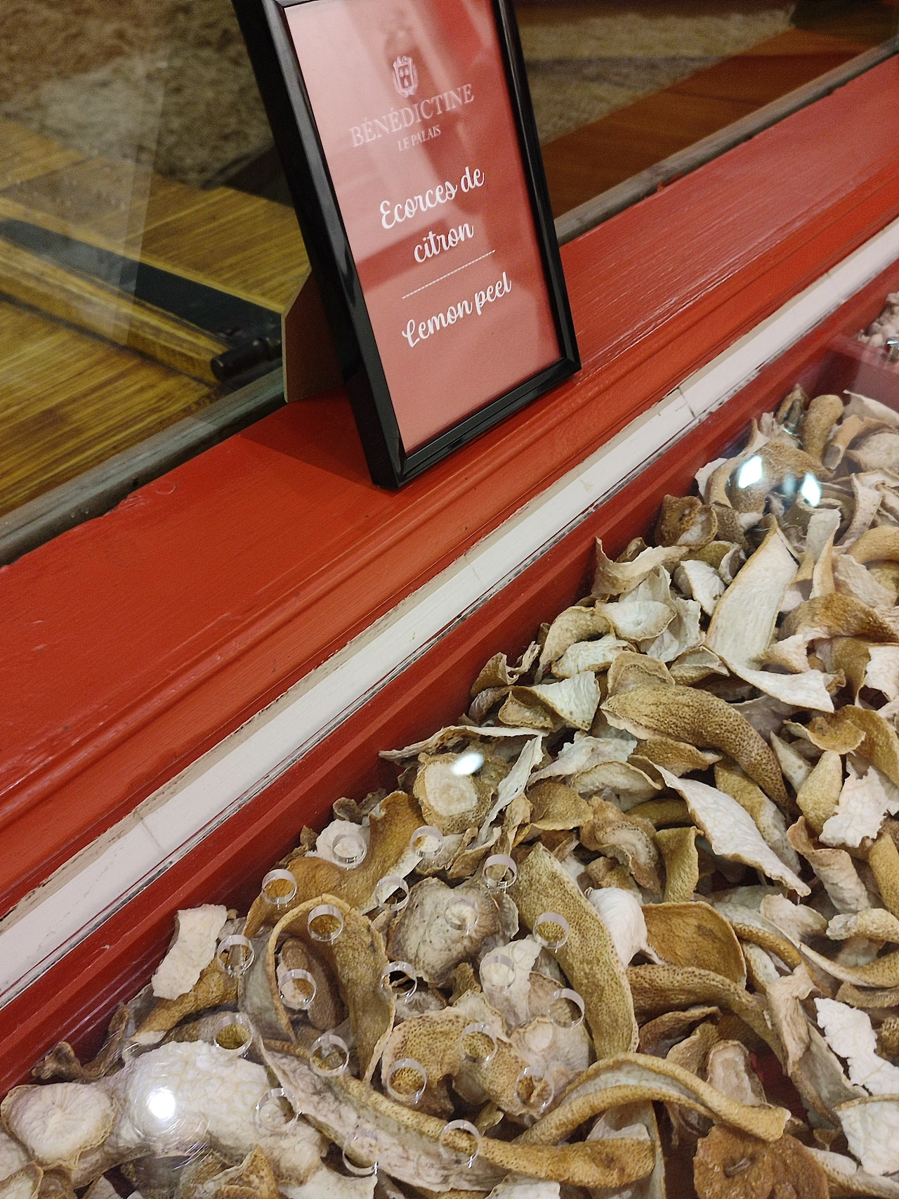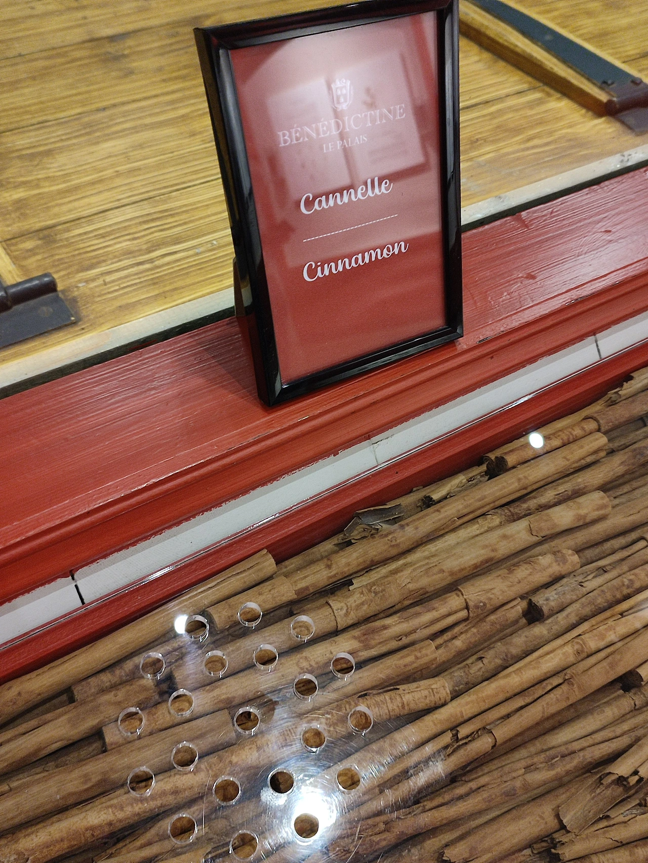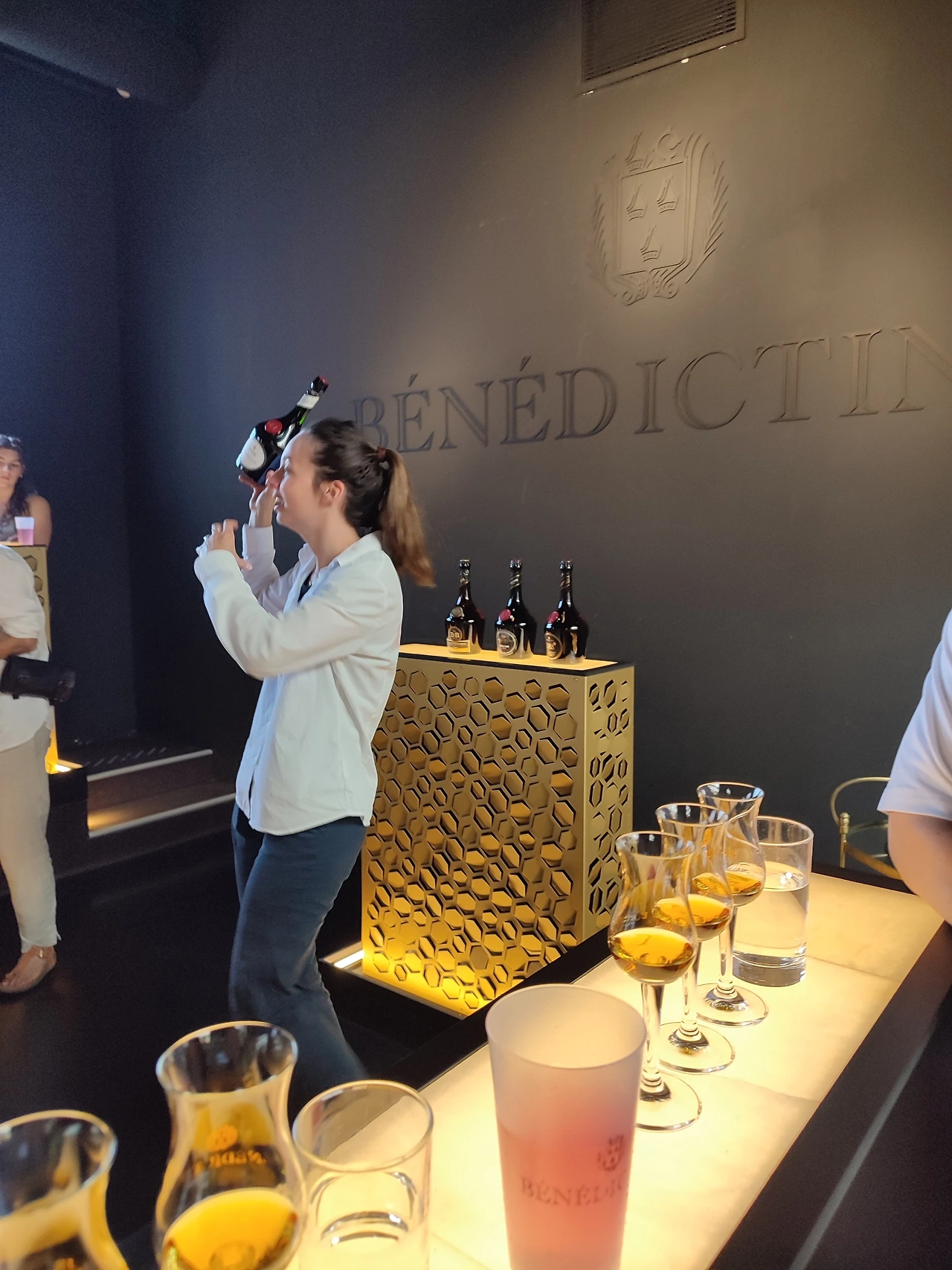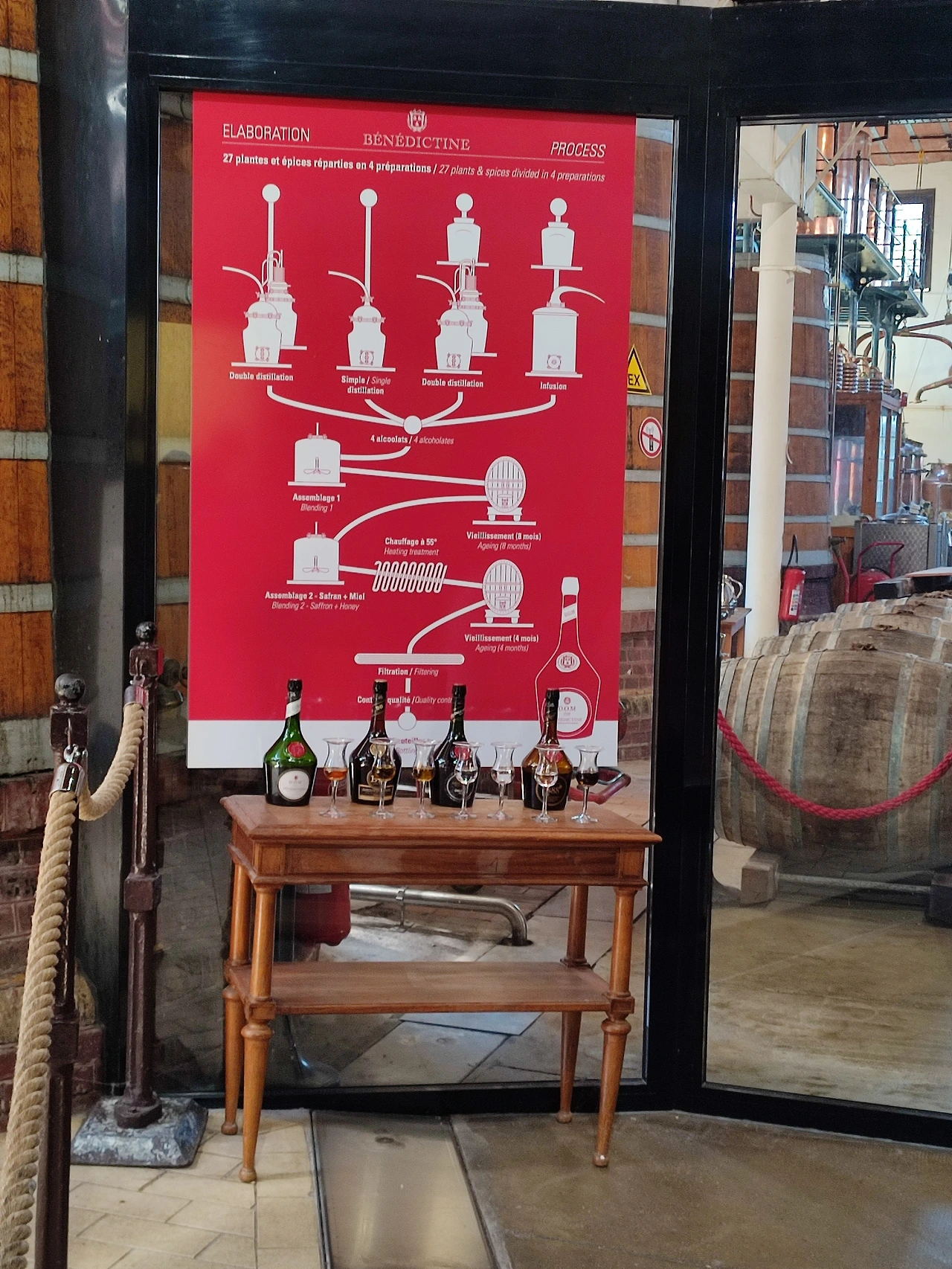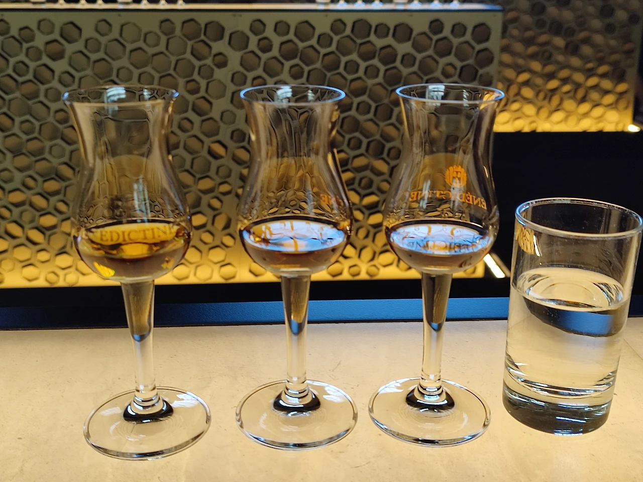 왼쪽의 첫 번째 잔이 베네딕틴 오리지널. 와인처럼 잔을 돌리지 말고 그냥 마시라고 한다. 가이드는 술을 마시지 못하는 사람들을 위해 시럽물을 제공했다.