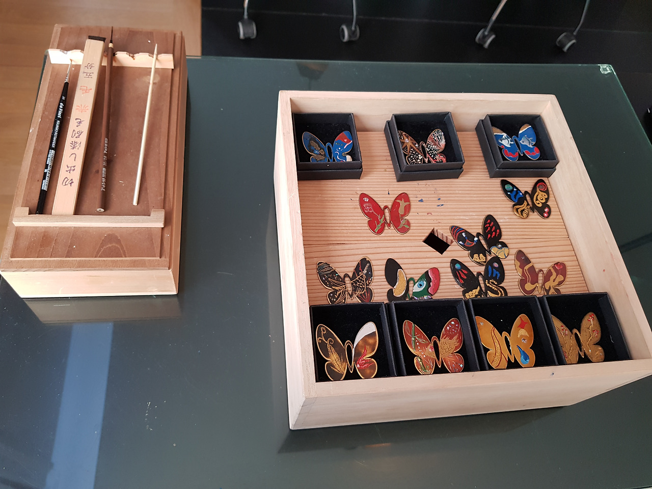 가이드 손에 든 용액은 빨간색인데 틀에 부어놓고 3일을 말리면 빨간 나비가 완성된다고 한다.