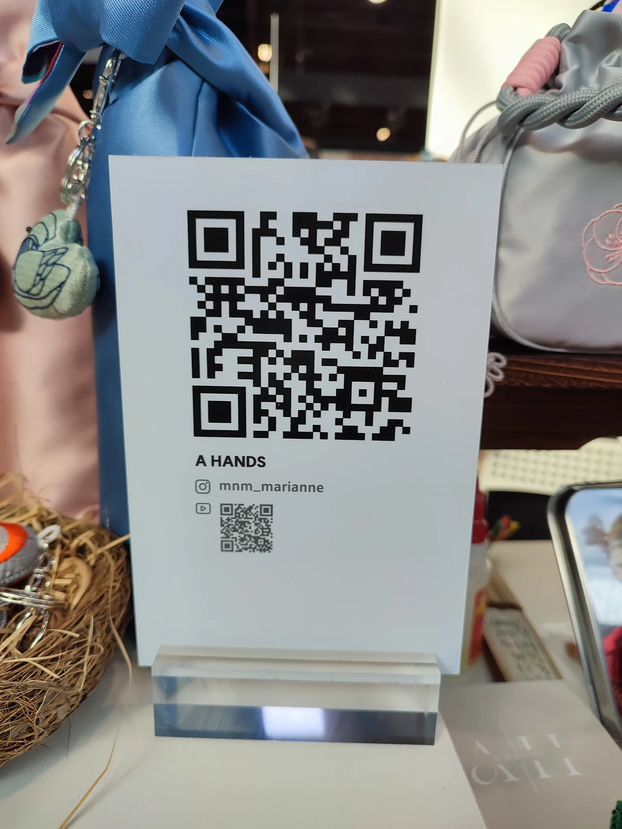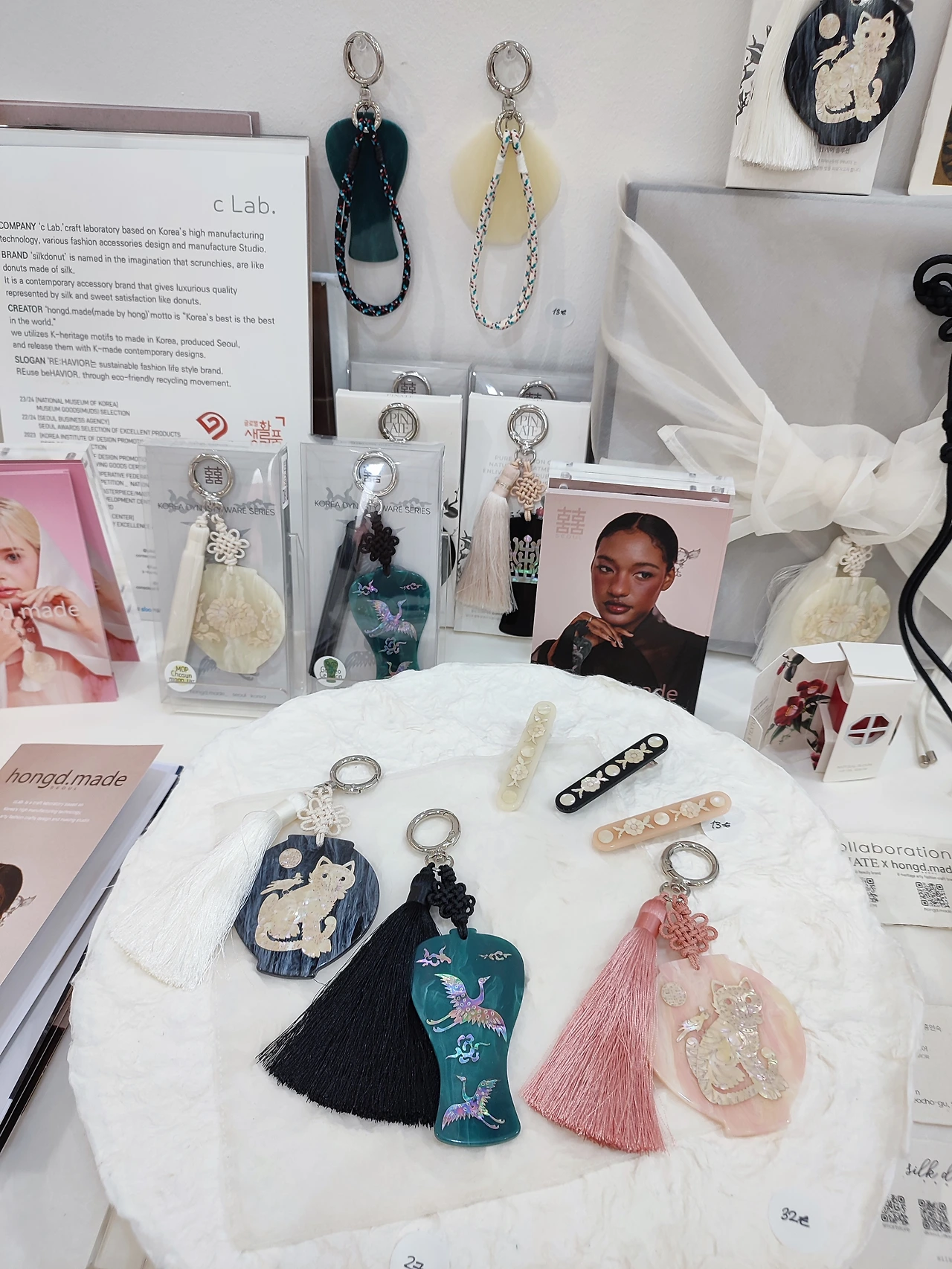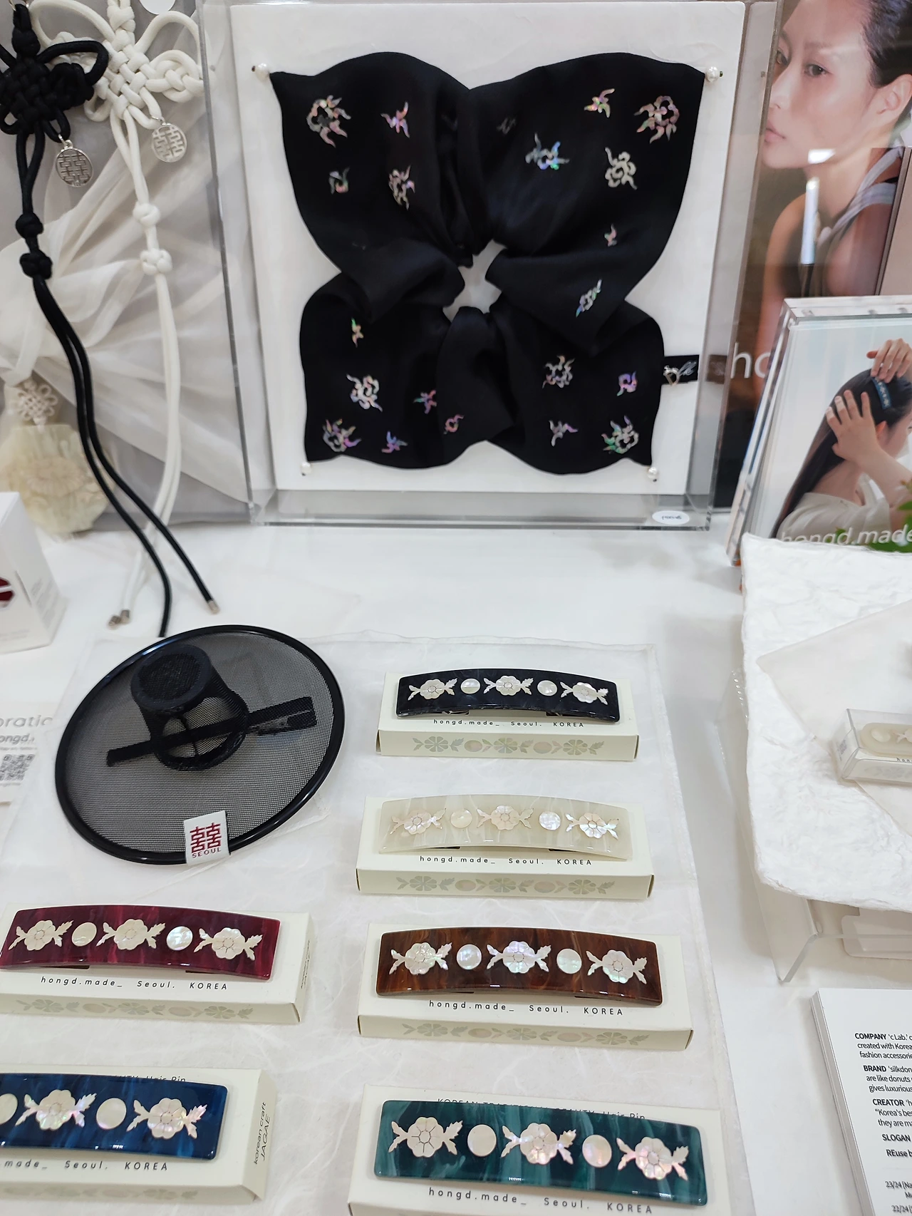 나전칠기로 만든 액세서리를 보고 신기해하고 있던 참이었다. 커다랗고 화려한 검정 머리끈을 착용한 홍드 메이드 대표 홍인숙 작가님이 친절하게 상품을 설명해 주셨다. 국립 중앙 박물관 기념품 샵에서 판매 중이라고 한다.