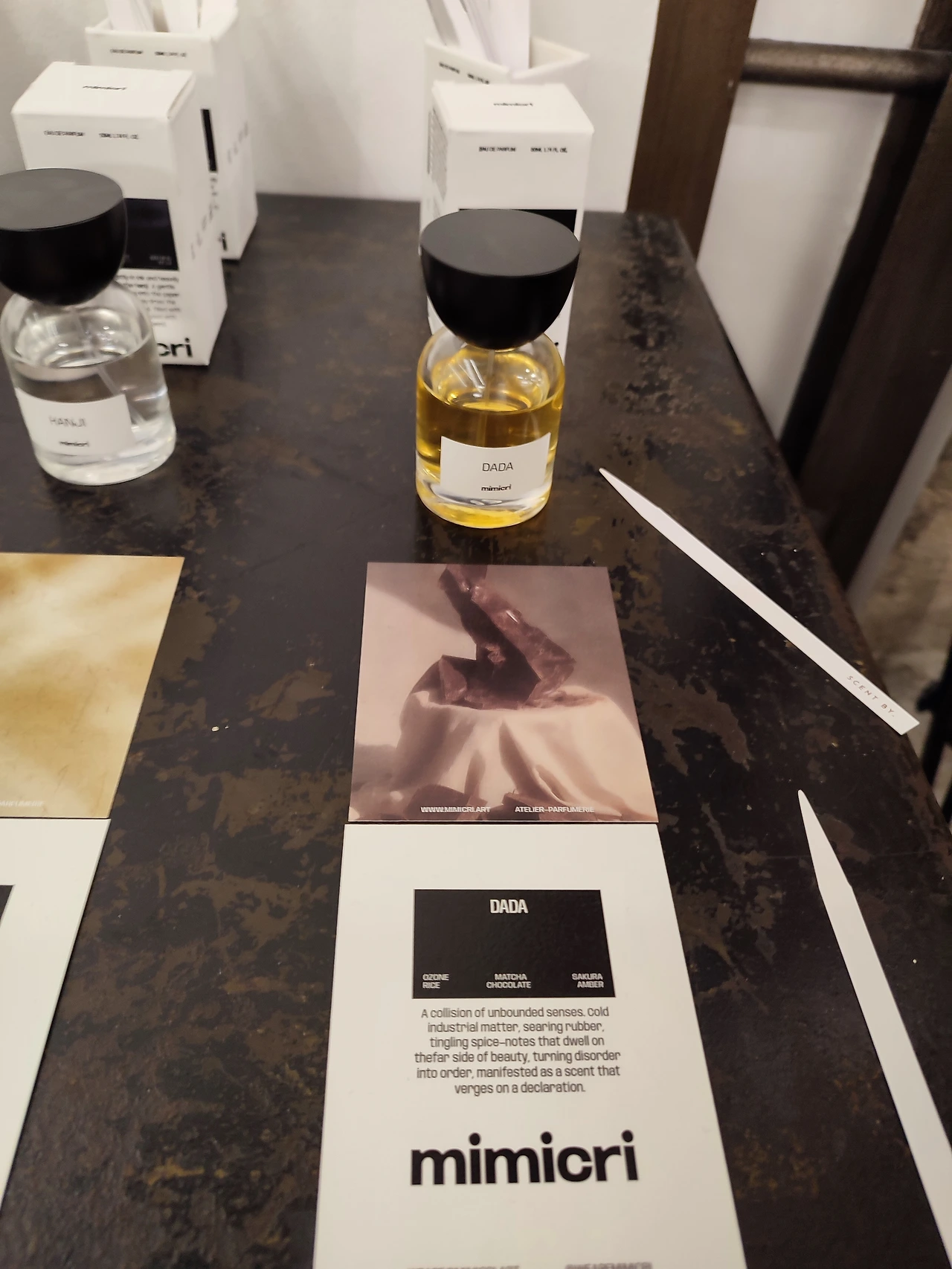 대부분의 브랜드는 굉장히 가벼운 향을 가지고 있는데 이 브랜드는 특이하게 앞줄은 강한 향을 뒷줄은 연한 향을 전시해서 고객층을 넓혔다. 나와 함께 간 친구는 우드향을 좋아하는데 De nude 향이 다음날까지 맡아졌다고 할 정도로 진했다. 파운더분께서 꽃향을 좋아하는 나에게는 아이리스 향을 베이스로 한 향수 Lay Figure 향을 추천했는데 말모양의 테스트지를 가방에 넣어놨더니 며칠 동안 은은한 향을 맡을 수 있었다.