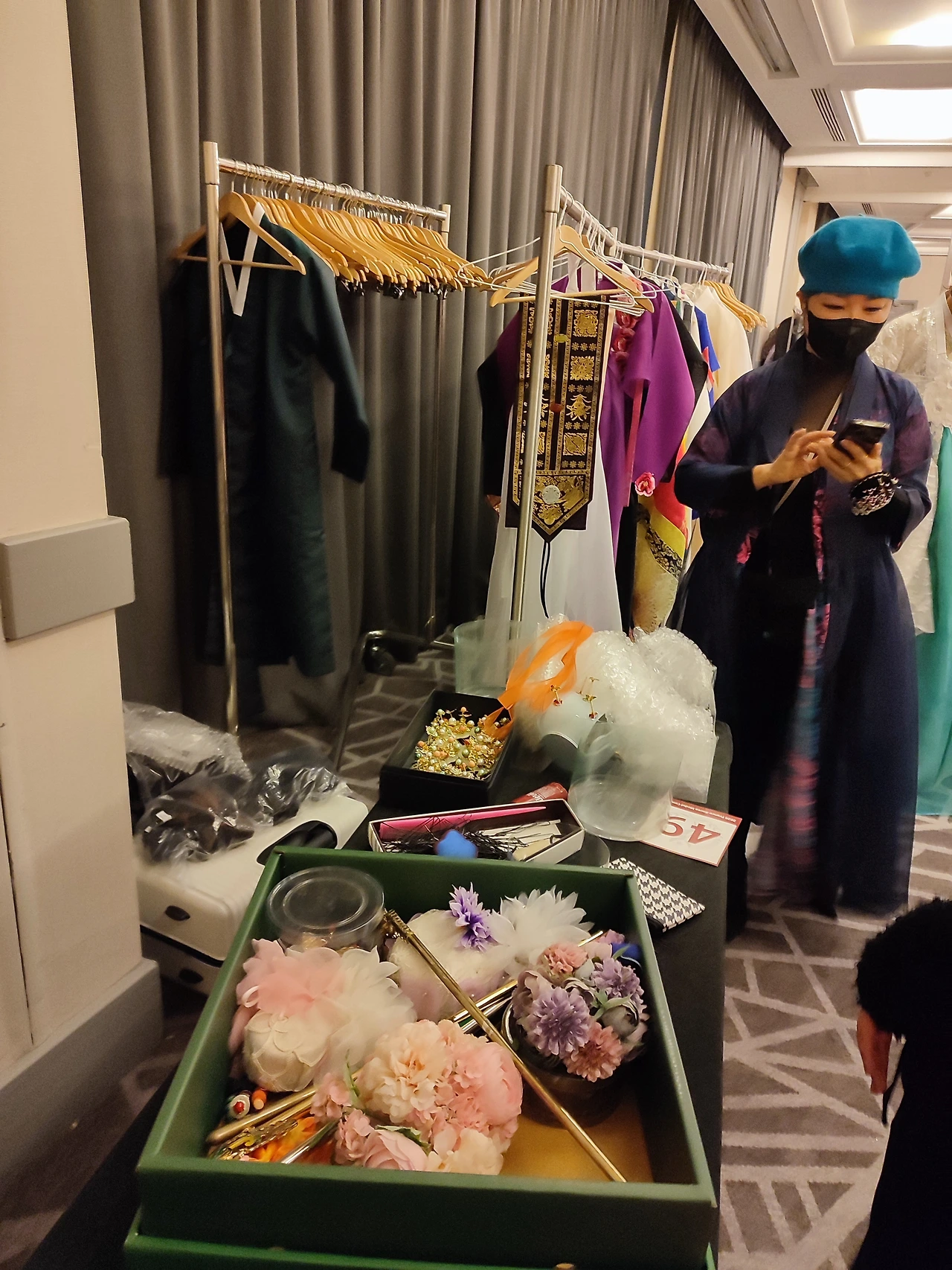 한복을 입은 후 나는 무척 분주했다. 한복이 무슨 색일지 알 수 없었기에 다양한 립스틱과 색깔별 액세서리를 준비해 갔다. 가져온 실핀과 꽃장식 머리핀을 꼽고, 립스틱을 바르고, 액세서리를 착용했다.
