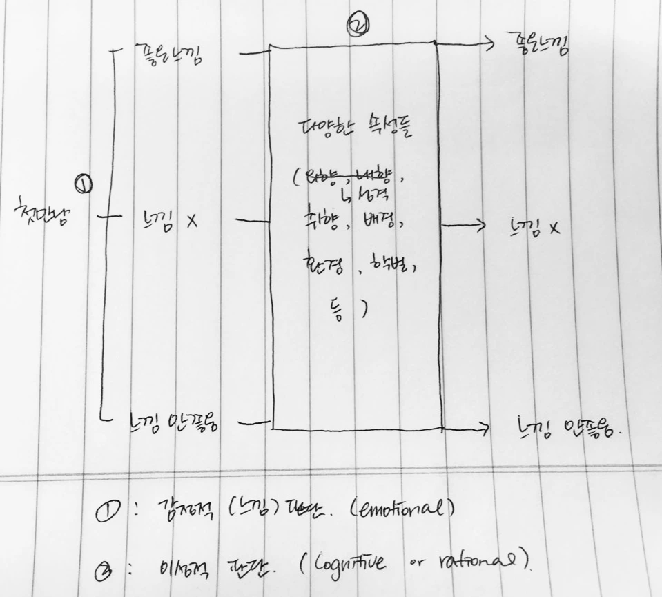 이 부분에 의문점을 가지고 생각해 보았을 때 나는 사람을 처음 만나고 그와 사적인 관계의 지속을 선택함에 있어서도 같은 성향의 영향을 받음을 알게 되었다. 그림 <나>처럼 사람을 처음 만나면 각 사람에 대한 나의 느낌이 있다. 세 부류로 나뉘는데 그것은 좋은 느낌, 좋지 않은 느낌, 그리고 느낌 없음이다. 그리고 나도 자의든지 타의든지 그 사람을 알아갈 수 있는 기회를 통하여 각 사람에 대한 속성들을 인지 한다. 하지만 일반적인 인간관계와 다른 점은 속성들을 인지한 후에도 또다시 호감에서 호감, 호감에서 비호감, 비호감에서 호감, 비호감에서 호감을 나누는 프로세스가 없다는 것이다. 예를 들어 느낌이 안 좋았던 사람들과 공적으로든 사적으로든 필요성에 따라 만남을 지속해야 하는 경우, 그들에 대해 알아가면서 그들이 인간적으로 참 괜찮은 사람임을 알게 되더라도 그들을 향한 나의 그 ‘느낌적인 평가’는 달라지지 않는다. 그리고 아무 느낌 안 들었던 부류에게는 세월이 지나도 시간이 가도 똑같이 아무 느낌이 들지 않는다.