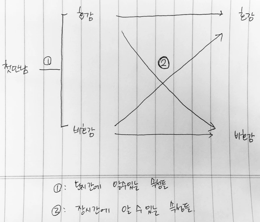 그렇기에 보통 그림 <가>와 같은 형태이다. 첫 만남 후 단기간에 알 수 있는 속성들을 가지고 호감과 비호감으로 나뉘어진다. 그리고 자의든지 타의든지 그 사람을 알아갈 수 있는 기회를 통하여 장시간에 알 수 있는 속성들을 인지 한 후 또다시 호감에서 호감, 호감에서 비호감, 비호감에서 비호감, 비호감에서 호감을 나뉜다. 그렇기에 한 사람의 친구들을 보면 그 친구들끼리는 공통의 속성을 가지고 있다. (나의 친구 A는 본인이 책을 읽는 것을 좋아하고, A와 친한 친구들은 대부분 책을 읽는 것을 좋아한다. 반면에 나의 친구 B는 책을 읽는 것을 좋아하지 않지만, 책을 읽는 사람을 좋아해서 B의 친구들은 대부분 책을 좋아하는 사람들이다. 이러한 예들은 사람들이 굳이 본인과 비슷한 사람이 아니더라도 본인이 선호하는 스타일의 사람들이 있고 그런 부분들이 인간관계 형성에 영향을 미칠 수 있음을 알려준다.) 하지만 나는 나의 20살 이후 만난 친구들을 한명 한명 생각해보면서 그들이 딱히 어떠한 특별한 속성을 공유하고 있거나 하지 않는다는 것을 깨달았다. 그렇다면 나는 인간관계를 어떠한 기준을 가지는 것일까?