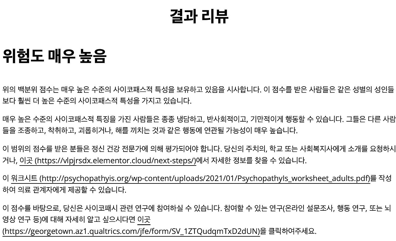이곳에 들어가면 사이코패시를 한국어로 측정할 수 있으며, 동시에 한국어로 결과를 받아 볼 수 있다. 범죄자용 그러니까 반사회적 인격을 가진 이(보통 범죄자)를 대상으로 만든 테스트인 PCL-R과 다르게 일반인들도 '자신의 사이코패스적 성향'을 진단 할 수 있으며, 사이코패시는 사이코패스이다/아니다로 말할 수 있는 게 아닌 스펙트럼이다-라는 전제로 개발된 도구이다. 사이코패스적 성향이 높으면 높을수록 점수가 높다.