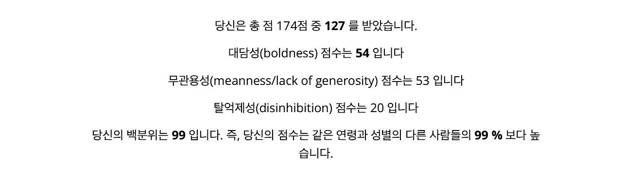이처럼 나 같은 범죄자가 아닌 일반인을 고려하여 개발된 TriPM으로는 탈 억제성이 낮게 나왔더라도, 다른 두 점수가 높다면, 사이코패스적 성향이 높은 사람이라는 결과를 갖는다. 나는 지킬 것을 지키지 않는 사람들이 이해가 가지 않기에 범죄심리학을 시작했고, 사회에 선한 영향력을 끼치는 것이 나의 존재의 이유라 생각하는 사람이기도 하다. 고로 난, 사이코패스 테스트로 가장 널리 알려진 PCL-R로는, 성향/감정선 등이 사이코패시에 해당하더라도, 범죄적 성향이 없기 때문에 사이코패스라고 나올 리가 없었지만, TriPM으로는 사이코패스적 성향이 높은 사람이라는 테스트 결과를 갖게 되었다.