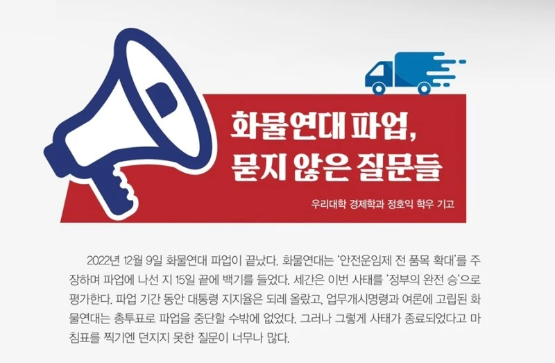 2022년 12월 9일 화물연대 파업이 끝났다. 화물연대는 ‘안전운임제 전 품목 확대’를 주장하며 파업에 나선 지 15일 끝에 백기를 들었다. 세간은 이번 사태를 ‘정부의 완전 승‘으로 평가한다. 파업 기간 동안 대통령 지지율은 되레 올랐고, 업무개시명령과 여론에 고립된 화물연대는 총투표로 파업을 중단할 수밖에 없었다. 그러나 그렇게 사태가 종료되었다고 마침표를 찍기엔 던지지 못한 질문이 너무나 많다.