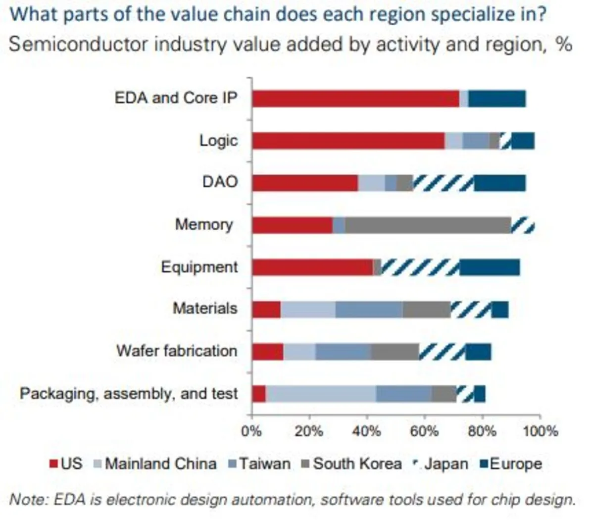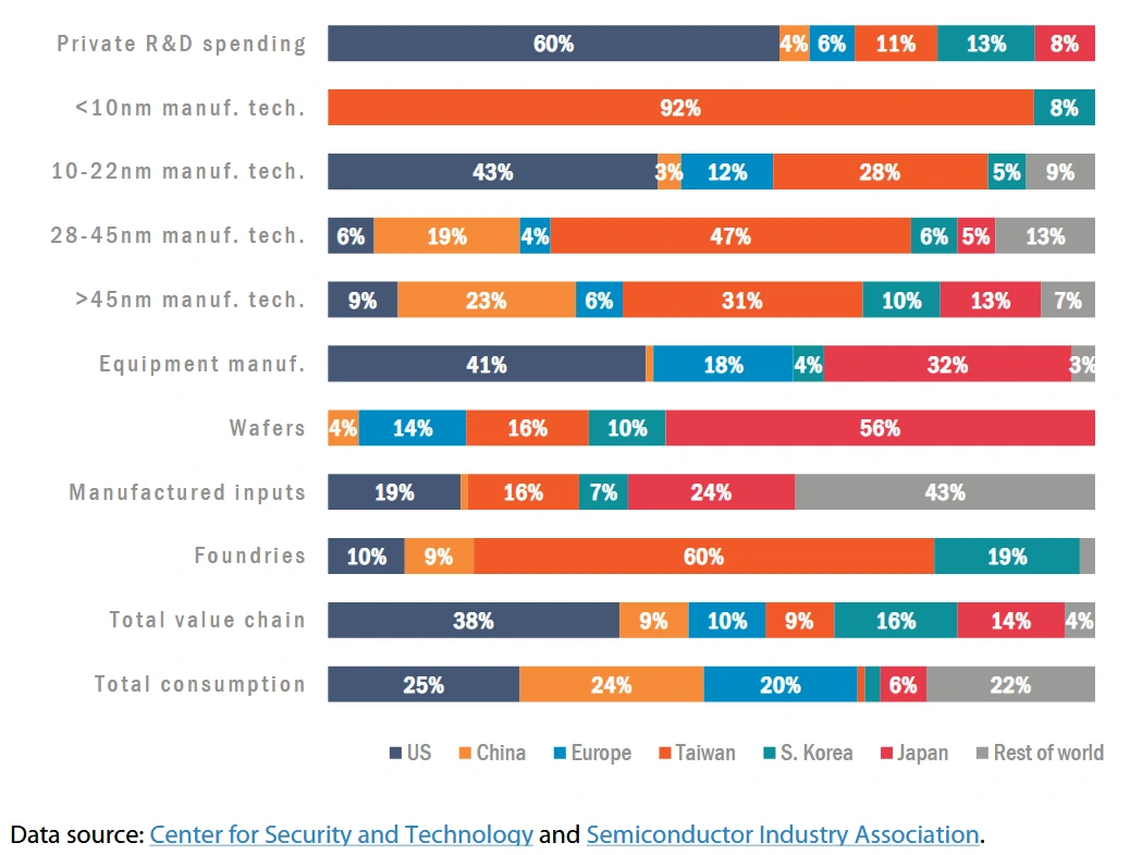 반도체 산업은 기술 경쟁력과 효율성의 원리에 따라 복잡한 글로벌 가치사슬(GVC)을 형성해 왔다. 미국은 각종 원천기술과 지식재산권(IP)을 바탕으로 기술 표준을 만들고 반도체 설계도를 제공한다. 주요 반도체 소재 부품 장비는 네덜란드, 일본 등에서 제공된다. 대만, 한국은 앞선 나라들에서 제공한 설계도 및 소부장을 활용하여 정밀한 반도체를 생산한다. 분업화된 공급망 하에서 그 어떤 나라도 반도체 설계부터 생산에 이르는 모든 과정을 혼자 처리할 수 없다.