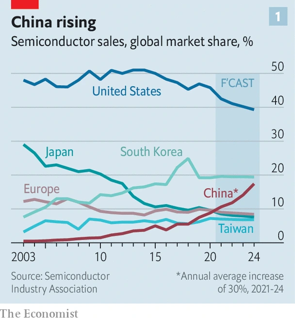 글로벌 가치사슬 안에서 중국 또한 떼려야 뗄 수 없는 위치를 점해왔다. 중국은 거대한 공장이자 시장으로서 기능하며 반도체 산업을 키우고 기술 격차를 줄이고자 애써왔다. 2015년 중국은 ‘제조 2025’를 공약하며 2020년까지 40%, 2025년까지 70%를 달성하겠다는 목표를 설정했다. 국가주의 경제 체제를 백분 활용하여 적극적인 자본 조달과 투자 지원으로 반도체 기업을 키웠다. 미국 실리콘밸리 • 대만 TSMC 출신 엔지니어를 대거 영입하고, M&A나 산업 스파이 등을 통하여 핵심 원천 기술을 확보해 왔다.
