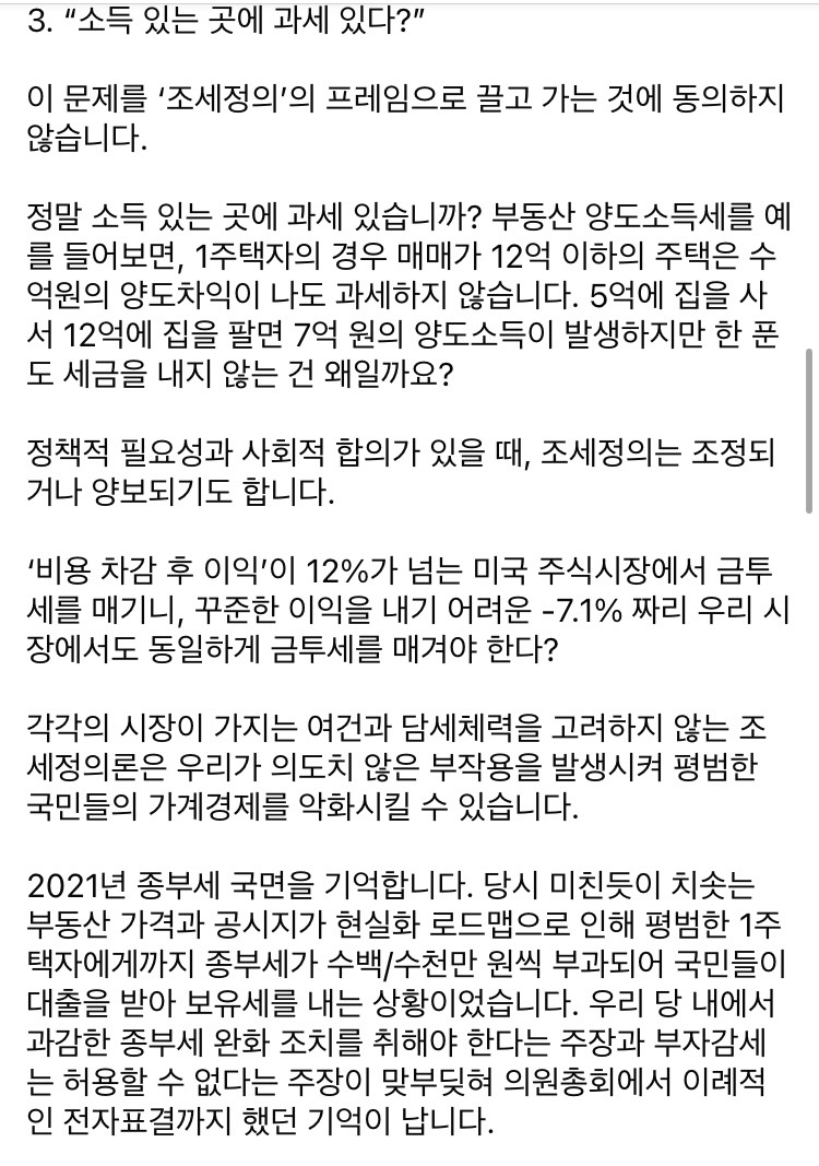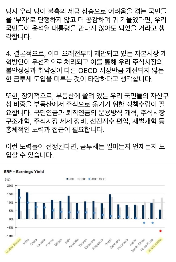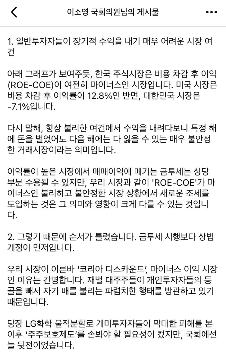 문제는 ‘코리아 디스카운트’와 ‘금투세’ 논란이 얽혀 있다는 사실이다. 우선 현재 시행되는 금투세법이 글로벌 표준에 부합하는 조세인지에 관한 세법적 이슈가 있다. 그리고 무엇보다 “국장은 탈출이 답”이라는 분위기에 금투세 논란은 ‘불난 집에 기름을 붓는 듯한 이슈’가 되어 버렸다.