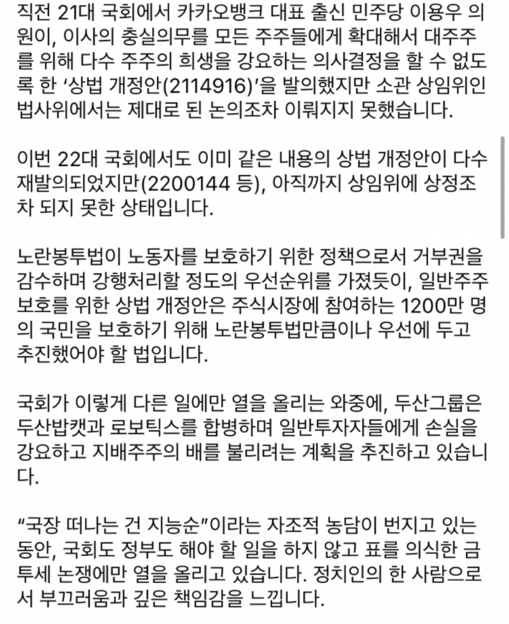 대신 물적분할-쪼개기 상장 같은 각종 편법에 관해서는 철저하게 처벌해야 한다. 무엇보다 '이사회 기능'을 정상화해야 한다. 지금 우리나라의 대주주는 실질적으로 이사회뿐만 아니라 감사위원회도 장악하고 있다. 공정하고 투명한 이사회 거버넌스를 만들어 일반주주의 권익을 보장할 장치가 필요하다. 상법을 개정하여 우리도 이사의 신의성실 의무가 회사뿐 아니라 전체주주로 확대될 수 있도록 해야 한다. 이렇게 <주주 자본주의/민주주의>가 작동할 수 있는 거버넌스를 구축해야 한다.
