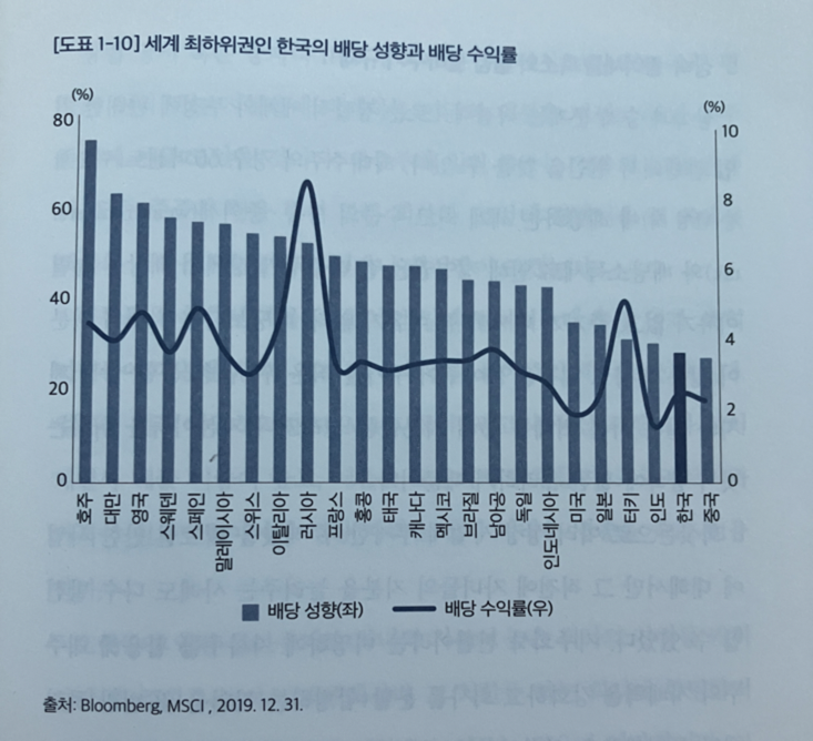 그렇다면 한국 기업들의 ROE가 유독 낮은 이유는 무엇일까? 기업이 자본을 쌓아두기만 하기 때문이다. 배당과 자사주 매입 등 주주 환원에 쓰거나 신규 투자에 써야 할 돈을 유보하고 있다는 의미다. 다시 말해 , <배당 성향이 낮기 때문에> 투자자 입장에선 투자하는 리스크 대비 얻어가는 이익의 크기가 작다. 투자할 매력이 없다.