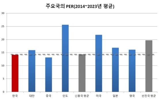 PER 은 ‘수익대비 주가’를 의미한다. 한국 상장사의 PER은 14.16인데, 이는 최근 시가총액이 지난 1년간 벌어들인 순이익의 14배가량 된다는 얘기다. 신흥국 평균(14.32)과 큰 차이가 없다. 중국(13.09) 보다 살짝 높고, 경제 규모가 대만(15.95)보다는 다소 낮다. 한국의 PER은 국제 평균 수준이다.