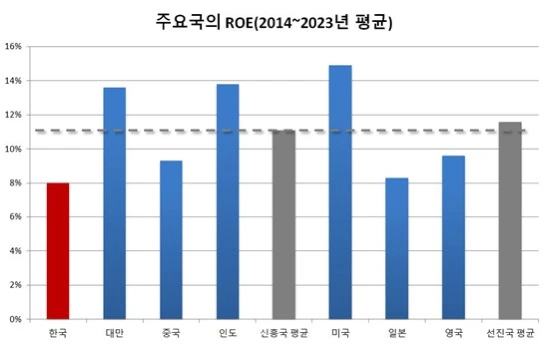 ROE는 ‘자기 자본이익률(return on equity)’을 가리킨다. 기업의 자기 자본 규모에 비해 최근 1년간 벌어들인 돈(순이익)이 얼마나 되는지 본 것이다. ROE가 낮다는 것은 몸집만 크고 버는 이익은 적다는 것을 의미한다. 한국의 지난 10년 평균 ROE는 정확히 8.0%로 간신히 낙제점을 면한 수준이다.