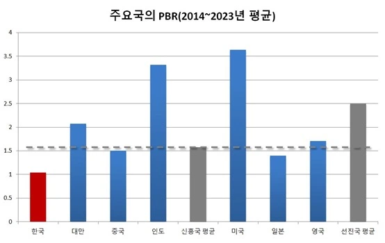 문제는 PBR (장부대비 주가)이다. 자본시장연구원이 2023년 발표한 코리아 디스카운트 분석 이슈보고서에 따르면, 2012년부터 2021년까지 우리나라 상장기업 PBR은 선진국의 52%, 신흥국의 58%로 분석대상 45개국 중 41위로 나타났다. 2023년 말 한국의 PBR은 1.05로 10년 평균값과 거의 같다. 한국 상장기업의 66%는 PBR이 1.0 미만이다. 이는 당장 청산해도 남는 게 없다는 의미이며, 코스피가 수년간 ‘박스권’에 갇혀 있는 상황을 보여준다(일명 ‘박스피’).