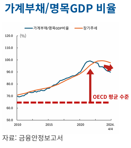 내일 ‘당장‘ 가계부채가 시스템 리스크로 전이될 확률은 낮다. 그러나 버블은 언젠가 터진다. 2008년 금융위기부터 1990년대 일본 버블붕괴에 이르기까지, 많은 금융불안은 특정 자산의 버블이 붕괴되며 비롯되었다. 이러한 이유로 2010년대 OECD 주요 선진국은 가계부채 비율을 낮춰왔다. 그 결과 현재 OECD 가계부채 비율은 60~70% 사이 범위에서 조금씩 하향하는 추세를 그려왔다. 반면 한국은 2010년대 이후 가계부채 비율이 폭증했다. 경기 활성화를 위해 부동산 건설경기를 의도적으로 부양하는 정책을 썼고, 동시에 수도권으로 주택 수요가 집중되면서 자산 불패 신화가 대두되었기 때문이다.