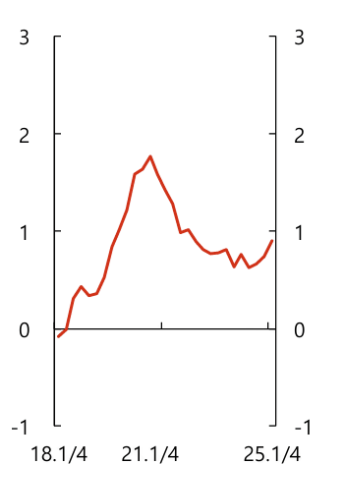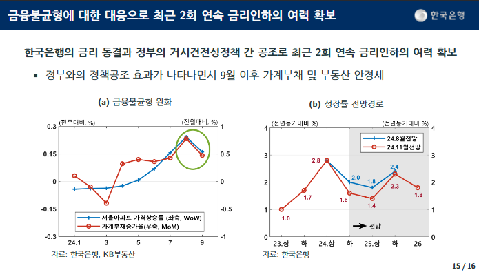 7월 한국은행 금리 결정 또한 거시건전성 정책 기조에 발을 맞춘 것으로 평가할 수 있다. 실제 2024년 8월에도 금통위는 25년 7월과 비슷한 결정을 내린 바 있다. 당시에도 기준금리 완화 요건이 충족되었으나 부동산 부문 신용 집중이 우려되어 금통위는 금리 동결을 선택했다. 당시 일부 언론에서는 한국은행 결정에 의문을 표하기도 했으나 결과적으로 정부와의 정책 공조 효과가 나타나면서 9월중 가계부채 증가율이 꺾이는 흐름이 나타났다.
