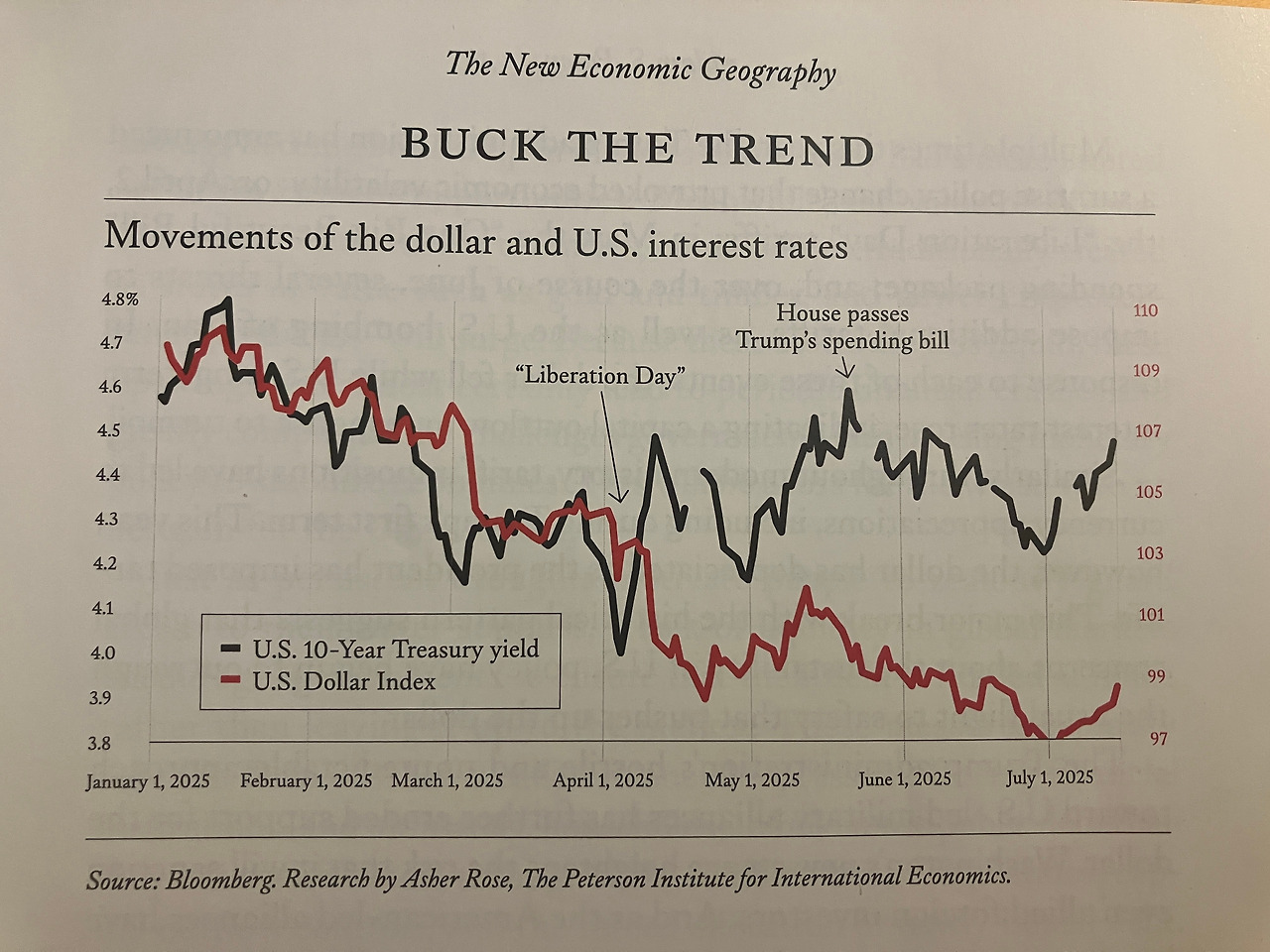 그런데 문제는 트럼프 행정부의 조치가 ‘달러 약세를 의도하면서도 진실로 기축통화 지위를 포기하고 싶어하지는 않는다’는 데 있다. 즉 달러 약세는 미국의 힘이 투사된 규칙을 통해 이뤄져야지, 시장의 자기 조정적 거래에 따라 나타나선 안 된다는 것이다. 이러한 이유로 많은 언론들은 4월 해방의 날 관세조치 발표 이후 나타난 미 국채 매도세가 중국의 희토류 압박과 더불어 관세율 유예 조치를 발표하는 데 큰 영향을 주었다고 평가한다. 트럼프 행정부의 정책이 강하게 관철될수록 시장은 미국 경제에 대한 신뢰에 의문을 표하고, 이는 달러 자산 매도 및 금융시장 전반의 불확실성으로 이어지는 실정이다. 트럼프 대통령은 ‘우리는 주식시장을 바라보지 않는다’는 반응을 보였지만, 금융권의 이해관계가 강력하게 관철되는 미국 정치의 특성, 그리고 국채 이자 비용의 급증은 감당하기 쉽지 않다.