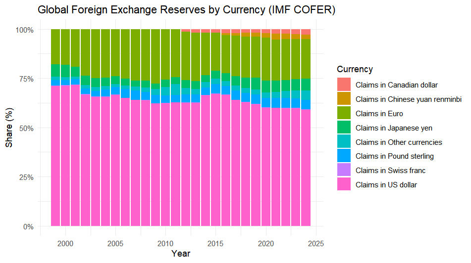 그렇다면 달러는 경쟁력을 상실하고 있는가. 우선 전 세계 외환보유고의 외화 비중(COFER)을 살펴보면, 2024년 기준 전 세계 외환보유고 외화 비중 가운데 미 달러화는 약 57% 수준을 차지하고 있다. 이는 70% 수준에 육박하던 1990년대에서 약 50% 수준으로 감소한 수치이지만, 여타 외화 자산과 비교했을 때 여전히 높은 지위를 누리고 있다고 평가할 수 있다.