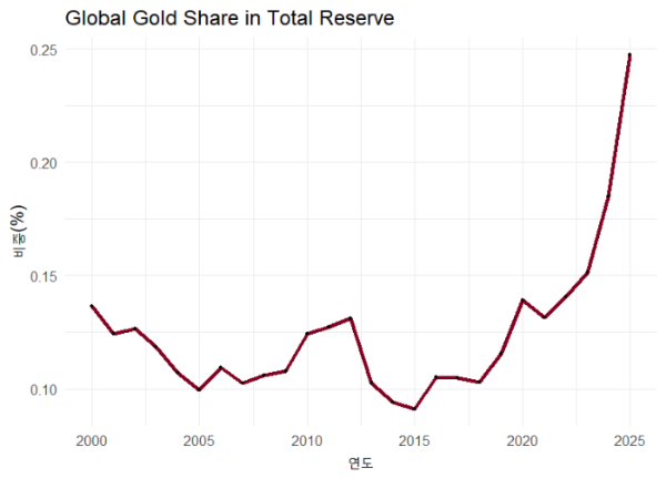 다만 2020년대 후반에 이르러, 전 세계 중앙은행의 금 보유량이 급증하는 현상에 주목할 만하다. 이는 주요국들이 달러보다 금을 안전자산으로 인식하고 축적하고 있음을 의미한다. 금이 각광받는 이유는 단기적으로 금리 인하가 단행되고 장기적으로 인플레이션 압박이 심화될 것이라는 전망에 대한 반영이라고 할 수 있다. 특히나 트럼프 행정부 정책에 따른 미국 경제 둔화에 대한 우려와 지정학적 불확실성의 고조로 금에 대한 선호도가 증가한 것으로 풀이된다. 세계금협회(WGC)가 발표한 2025년 설문조사에 따르면, 중앙은행 중 73%는 ‘외환보유액에서 달러 비중이 현재보다 낮아질 것’으로 예상한다고 답했다.