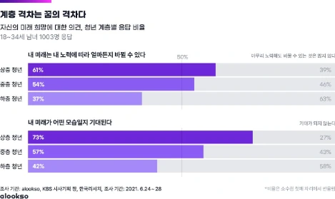 최근 KBS 시사기획 창이 한국리서치와 함께 조사한 <공부방 계급론> 이란 통계가 있었다. 해당 조사는 청년들에게 학창 시절에 공부방이 있었는지 여부를 물어 상/중/하 층을 나누고 질문을 던졌다. 삶에 대한 인식을 묻는 질문에 대한 상층과 하층의 답변은 극명하게 갈렸다. 이러한 데이터에 근거했을 때 이런 상이한 청년들을 하나의 세대로 묶어서 일반화 할 수 있을까? 과연 하층 청년들의 목소리가 우리 공론장에서 제대로 반영되고 있는가? 언론이 소위 '공정 여론'이라고 언급하는 청년세대의 여론이 '전체 세대'를 대표하는 것이라 볼 수 있을까?