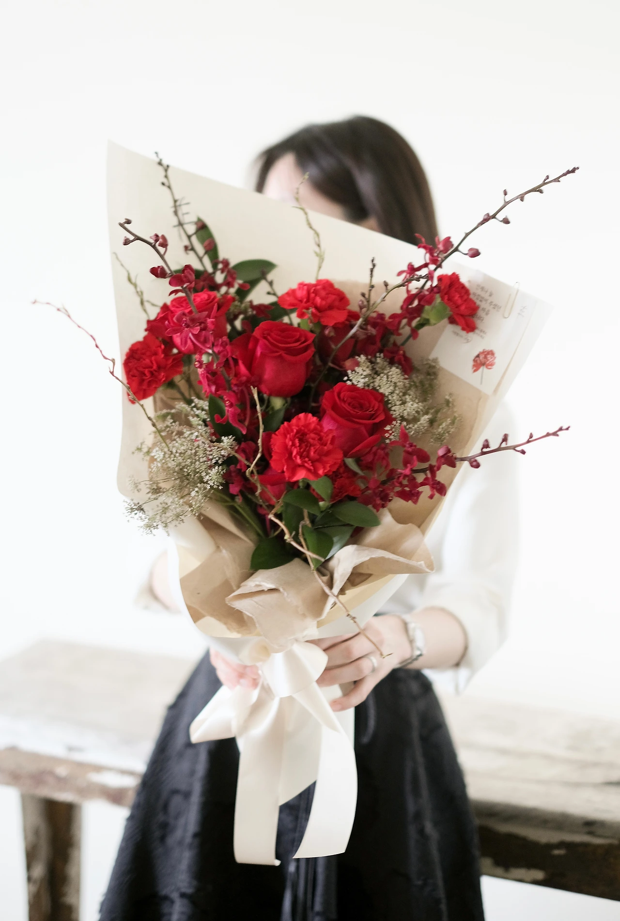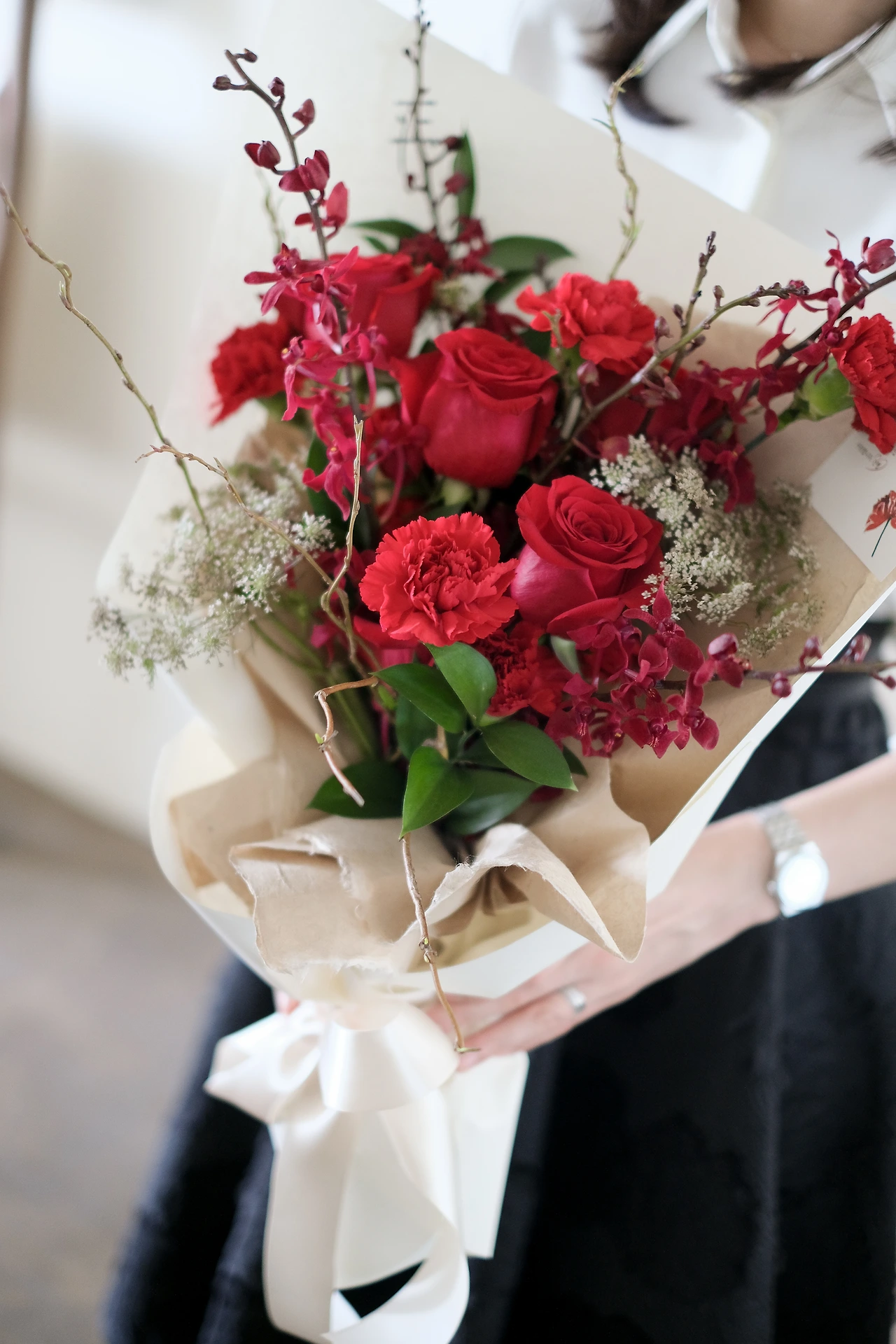 카네이션 몇 송이를 꼭 쥔 꽃다발 속