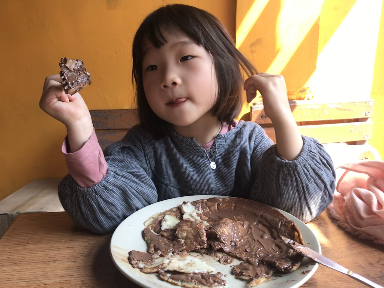 빵집에서 내려다보는 경관이 멋졌다. 창을 통해 솔솔 들어오는 바람도 좋고. 들어갔는데 자리가 없어서 기다리려고 했더니 합석 시스템이 있었다. 러시아에서 오셨다는 중년의 여성분께 양해를 구하고 합석. 그녀는 너무 배가 고파서 평소보다 많은 음식을 시켰다며 입도 데지 않은 오렌지주스를 깍두기에게 주셨다. 꼴깍꼴깍 한 컵 잘도 먹는 깍두기. 이 녀석 지난번에 한번 시켜줬더니 또 초코타령었다. 누텔라팬케익을 먹겠다고 하는.....그래.....오늘은 너의 날이니까. 누텔라 팬케익과 내 커피를 한잔 주문하고 기다리는데 빈자리가 나서 러시아 아주머니께 감사인사를 드리고 창가 자리로 옮겼다.
