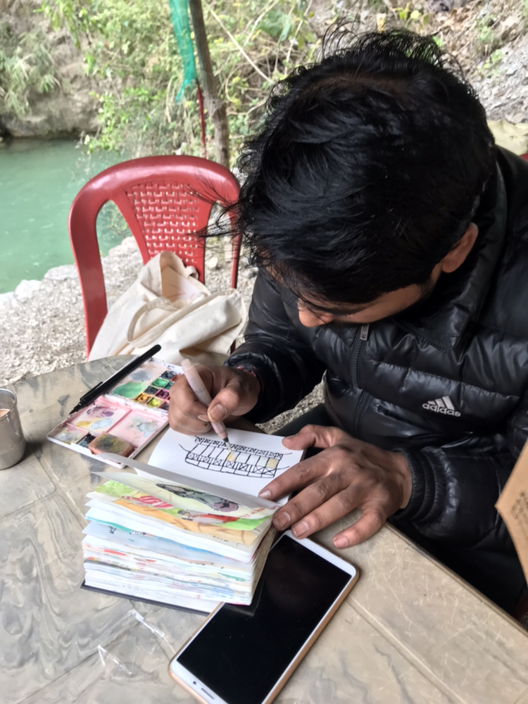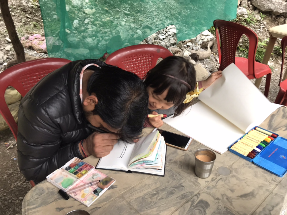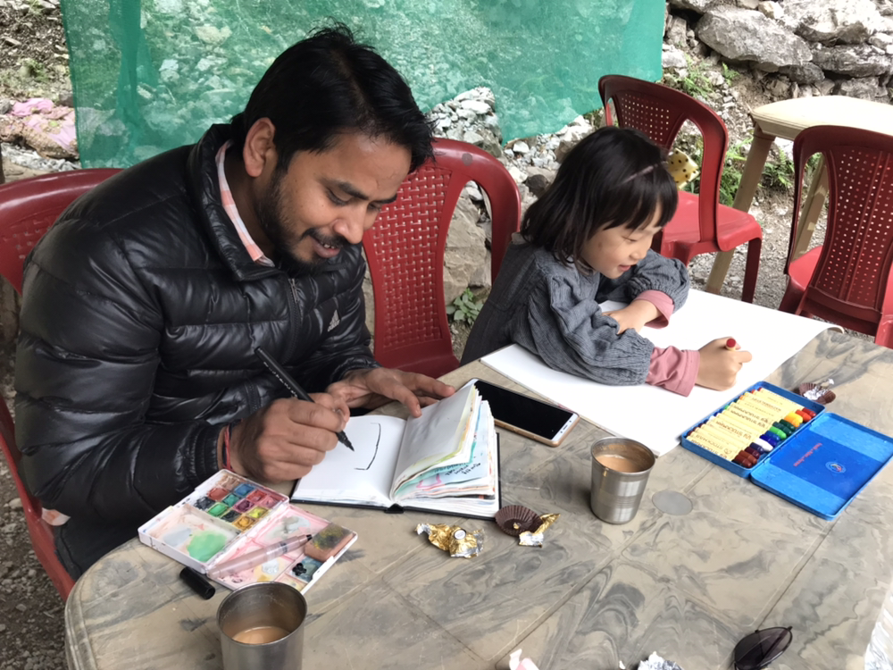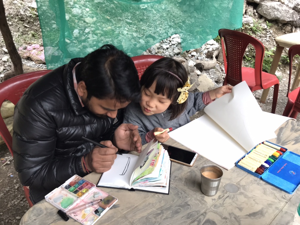날이 어제보다 추워 물에 들어가지는 못했다. 어제 간 폭포보다 덜 멋있어서 사진 찍을 감흥도 없고...짜이 한잔 마시고 그림 그리며 한 시간쯤 놀다가 배고프다고 하는 깍두기를 데리고 다시 마을로 내려왔다.