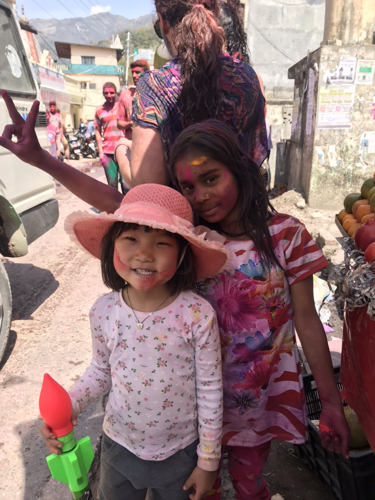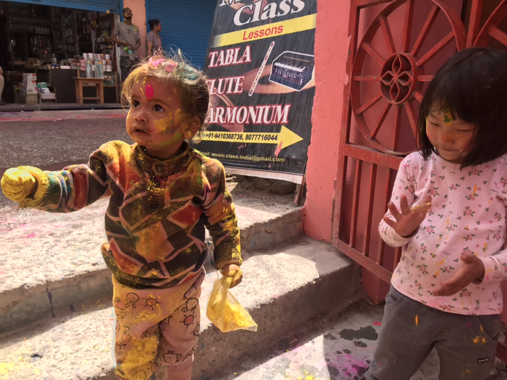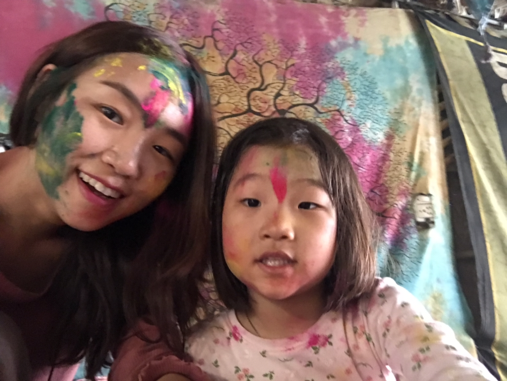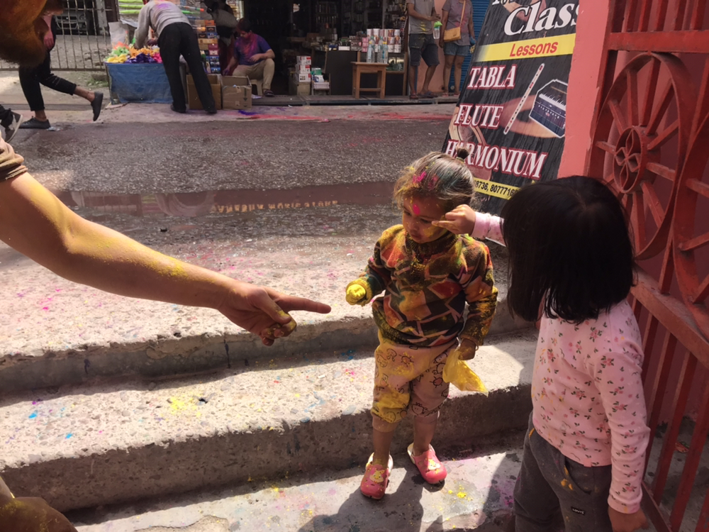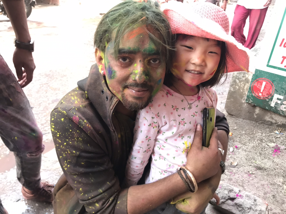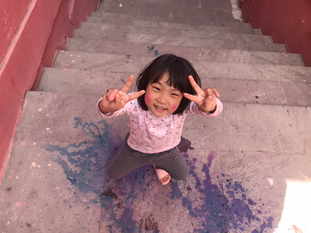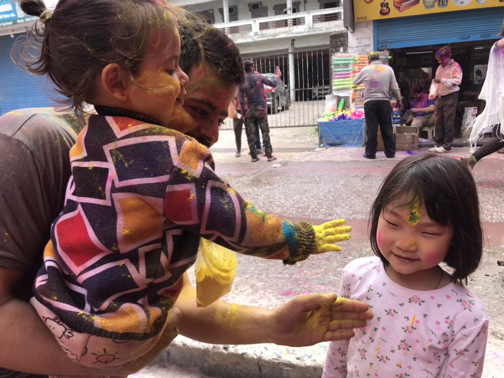 아빠와 지나가는 한참 어린 인도 아기가 우리에게 다가왔다. 인도 아기와 깍두기는 서로의 얼굴을 쓰다듬으며 색가루를 묻히고 꺄르르 웃었다.