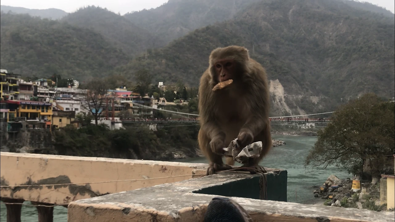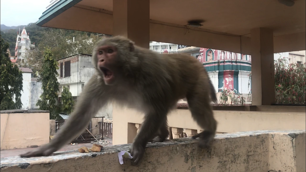 특히 우리가 머물렀던 아쉬람 발코니에는 수시로 원숭이 친구들이 몰려오곤 했다. 심지어 깍두기 키만한 원숭이가 낮에 열린 방문으로 들어와서 냉큼 사과를 집어가는가는 일도 있었다. 너무 비현실적인 광경에 순간 모든 동작이 일시정지. 옆에서 깍두기는 웃겨 죽겠다며 배꼽을 잡고 구르고 있었다. 이 일만큼은 평생 기억하지 싶다. 그런데 고 녀석 참 사과 다 먹고 또 와서 방문을 연다. 인도 친구들에게 배운 대로 신고있던 쓰레빠를 냉큼 벗어 오른손에 들고 번쩍 하늘로 들었다. 호랑이 엄마 표정으로. 그랬더니 걸음아 나살려라 도망가는 녀석이었다.