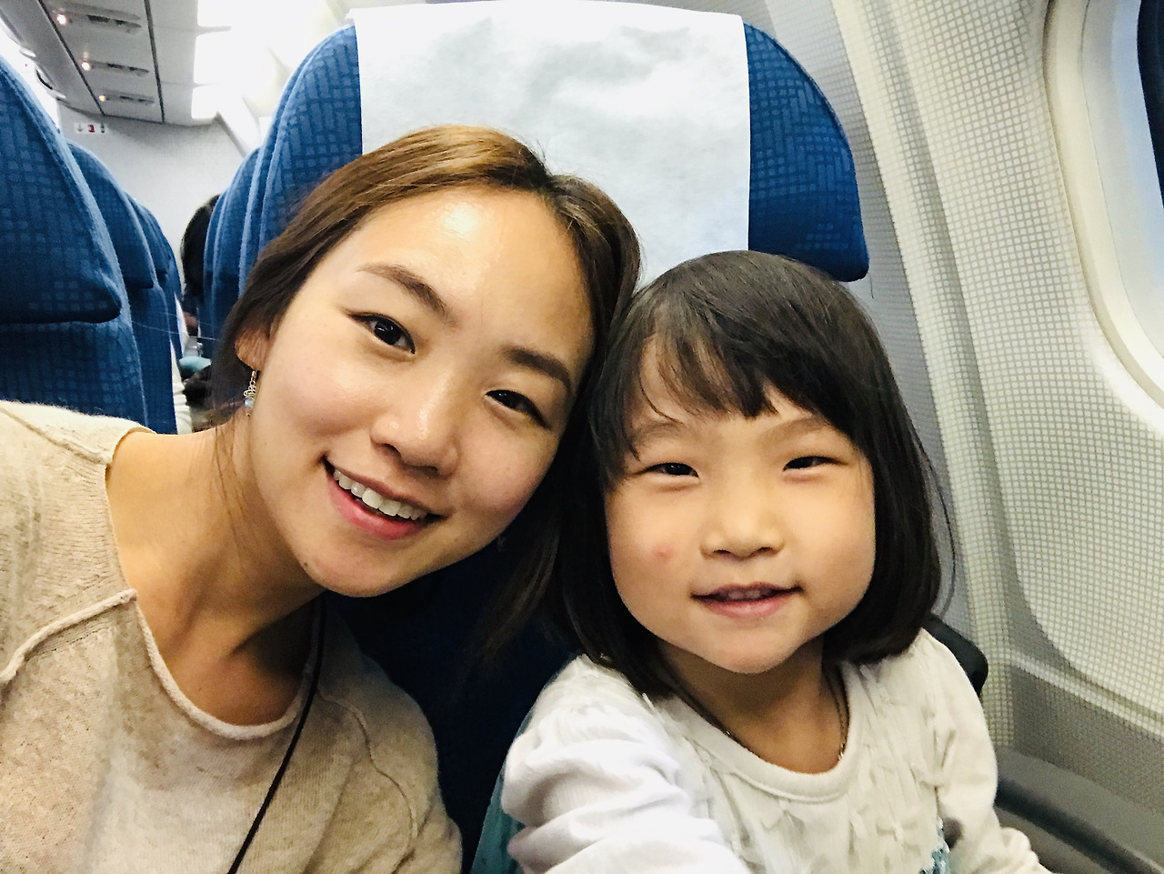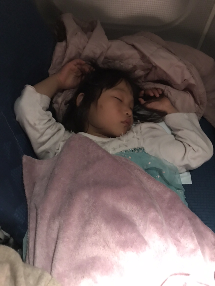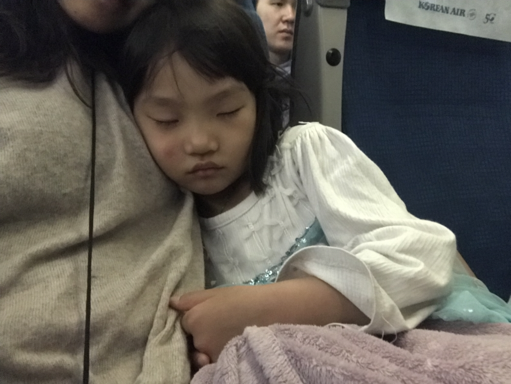 한참을 더 놀다가 누워서 자자하니 순순히 눕는 그녀. 꽤나 피곤했던 모양이었다. 금새 스르륵 잠이 들었다. 그리고서는 착륙까지 쭈욱 내리 잤다는....효녀깍둑.
