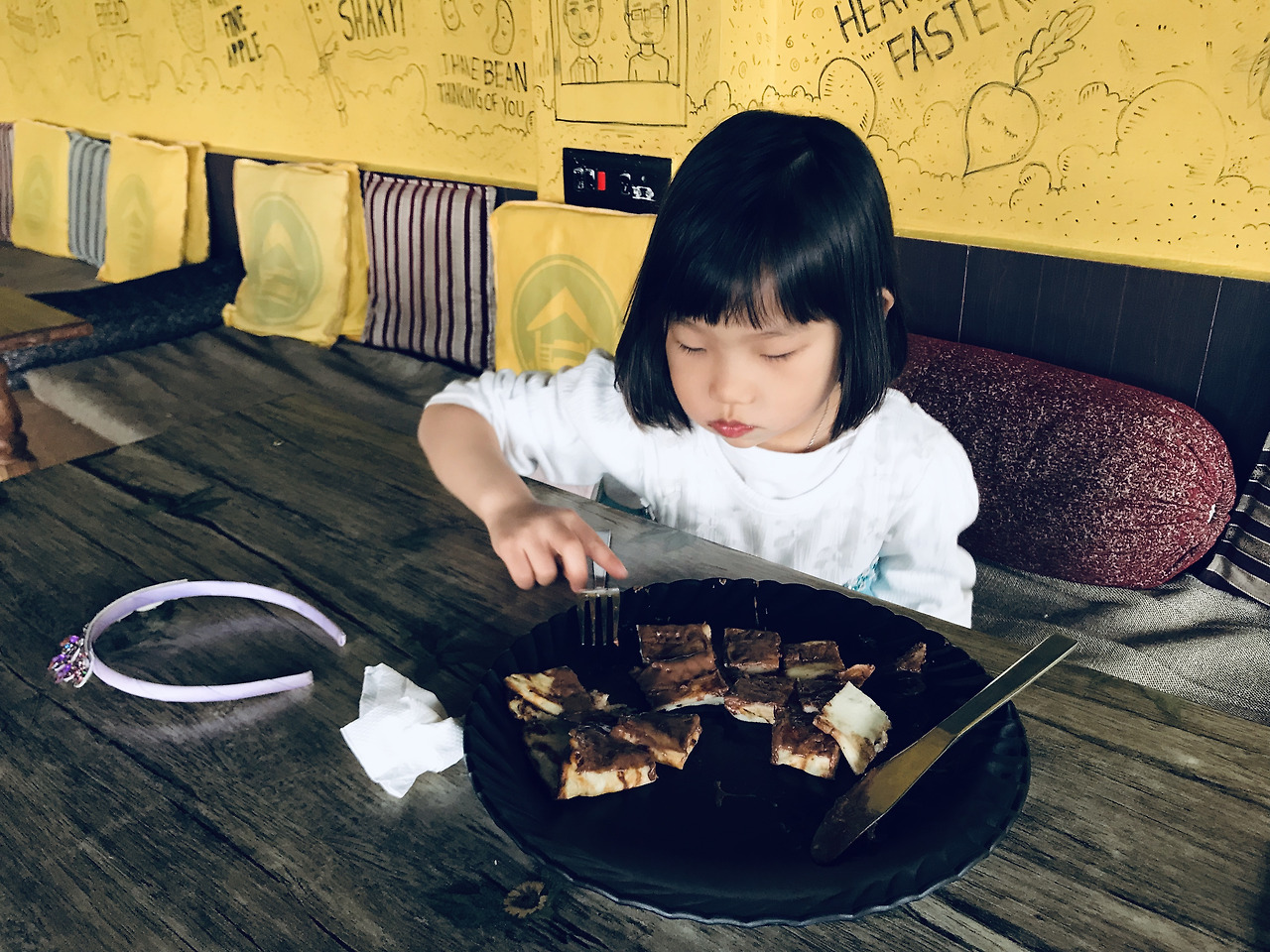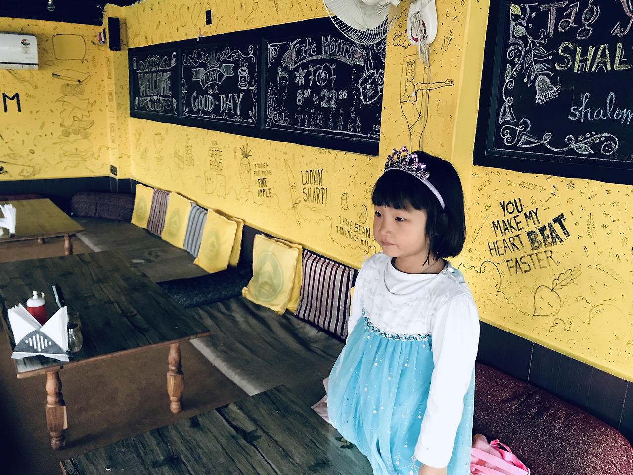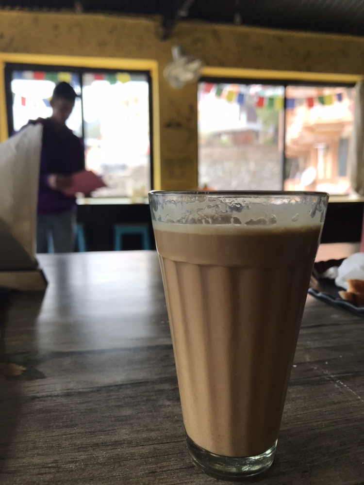 엘사 공주는 누텔라 팬케익을 주문했다. 평소 같았으면 택도 없는 메뉴 선택이지만 인도에 마음을 붙이라는 의미로 시원하게 시켜줬다. 남길게 뻔하기 때문에 내 메뉴는 따로 시키지 않고 짜이(인도식 밀크티)를 한 잔 주문했다. 인도에서 마시는 짜이라니 이 얼마만이냐 비주얼에 감동했지만 생각보다 맛이 별로였다.