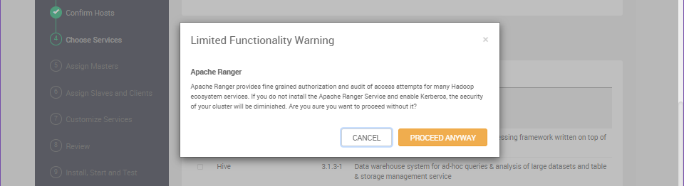 의존성 서비스 미선택 경고가 발생하나, 튜토리얼 진행에 필수사항이 아니므로, "PROCEED ANYWAY" 클릭