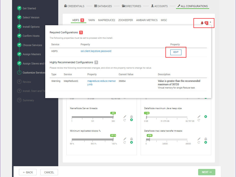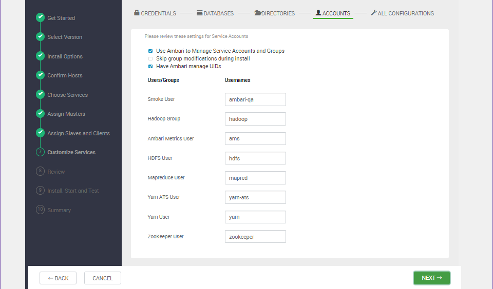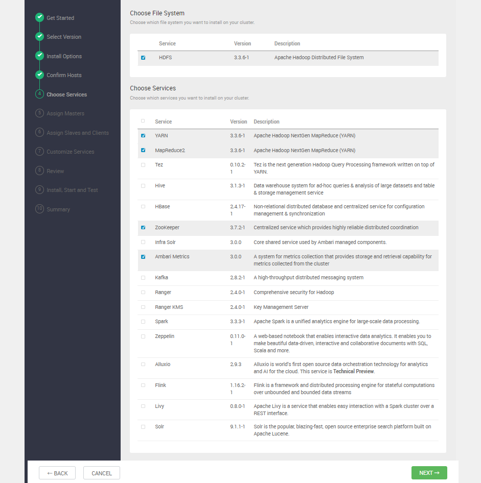 본 튜토리얼에서는 HDFS, YARN, MapReduce2, Zookeeper, Ambari Metrics 선택.