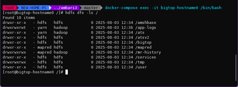 ✔ Container ambari3-bigtop-hostname1-1 Started 0.5s