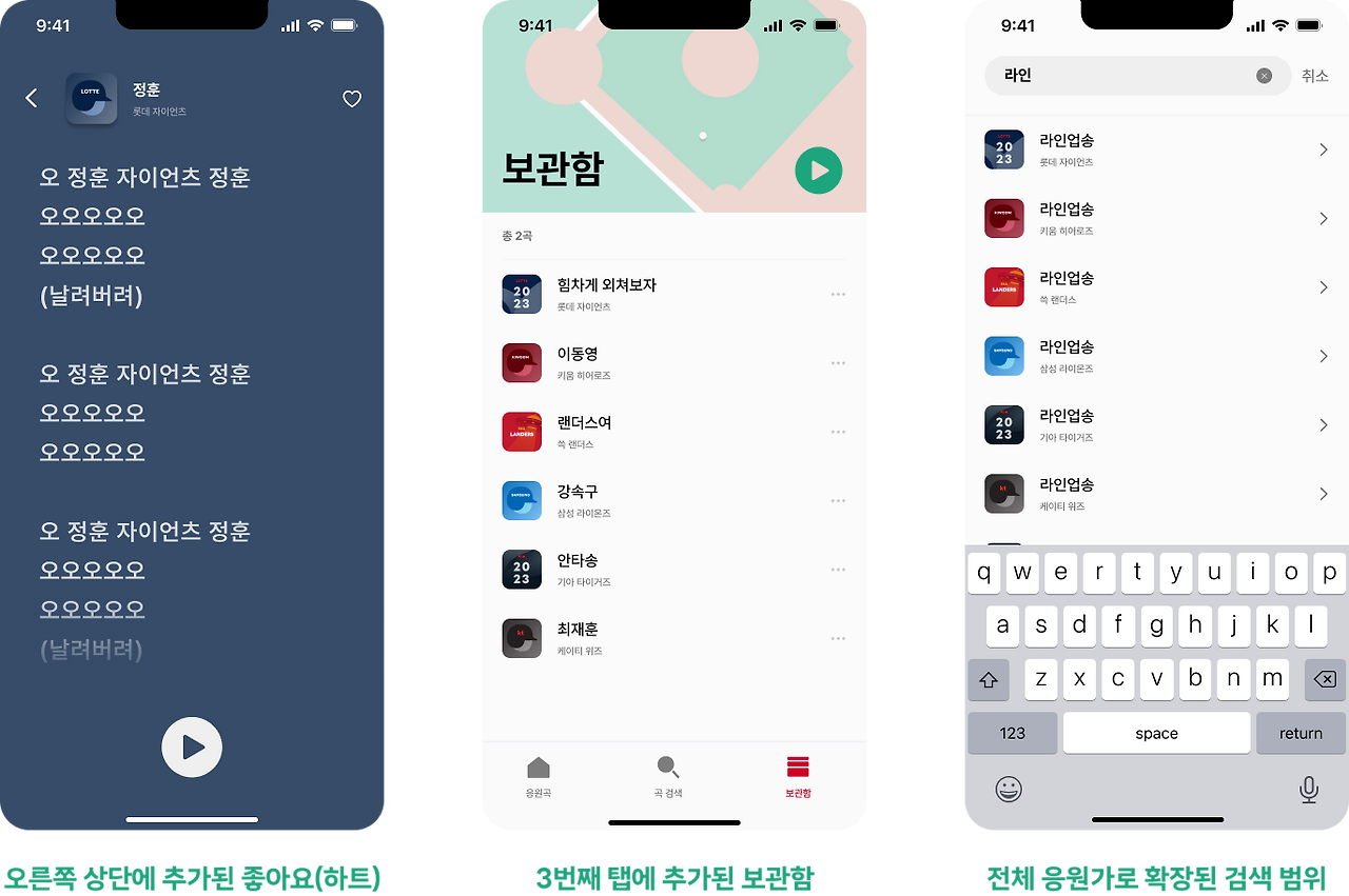 타 구단의 응원가도 즐겨 듣는 타깃군을 위해 좋아요(하트) 버튼과 보관함 기능을 추가했습니다.