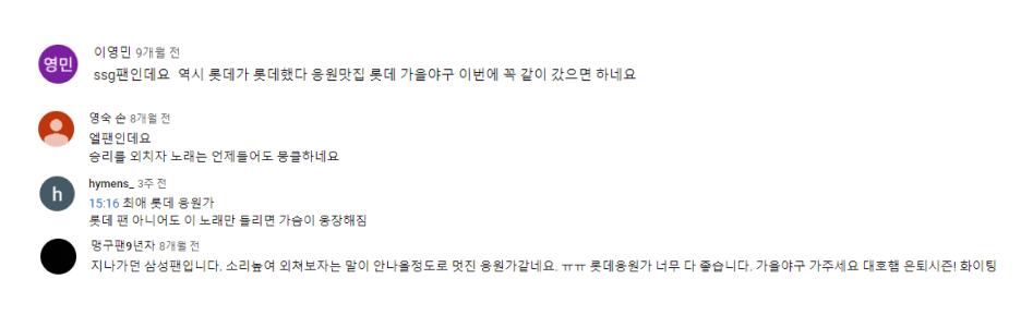 롯데 자이언츠의 응원가 영상뿐만 아니라 타 구단의 응원가 영상에서도 이와 같은 댓글들을 많이 찾아볼 수 있었습니다. 위와 같은 인사이트를 통해 '타 구단의 응원가를 듣는 것에 대한 니즈가 있음'을 확인할 수 있었습니다.
