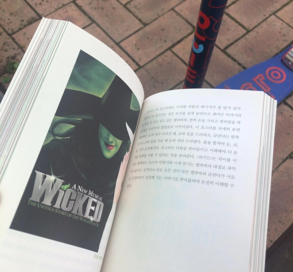 공연을 본 후 넘버 몰아듣기, 캐스팅별로 노래 들어보기 등 <위키드>에 푹 빠져 지냈다. 그러다가 [뮤지컬 탐독]이라는 책에서 <위키드> 이야기를 깊이 읽을 수 있었는데 특히나 포스터에 담긴 작품의 메시지를 설명한 부분이 인상적이었다. 게다가 두 주인공의 상반된 캐릭터를 드러내기 위해 발성마저 대비된다는 음악적 부분도 흥미롭게 읽었다.