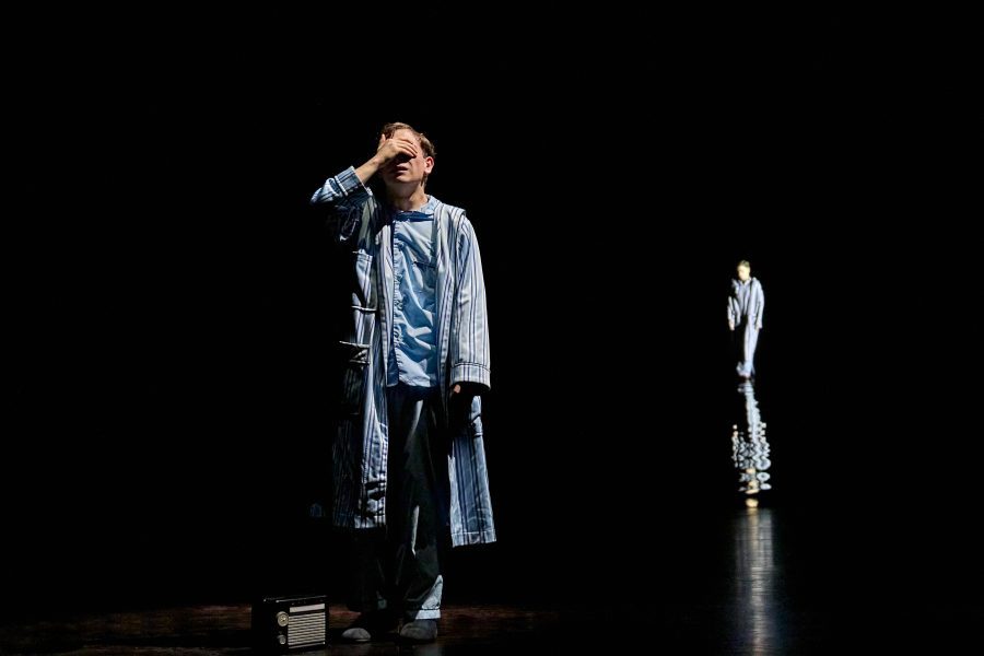영상과 조명이 만들어 낸 희미한 환영은 재가 떠다니는 듯한 착시를 일으켜 내가 실제로 ‘뒤집힌 세계’에 들어온 것으로 착각하게 만들어요. 한 인물을 연기하는 두 명의 배우가 동시다발적으로 등장해 순간 이동을 하는 것처럼 보이기도 합니다. 조도를 낮춰 투명막에 비춘 영상은 실제 세트와 구분하기 어려웠어요. 이러한 다양한 효과로 ‘기묘한’ 분위기를 극장 전체에 구현합니다.