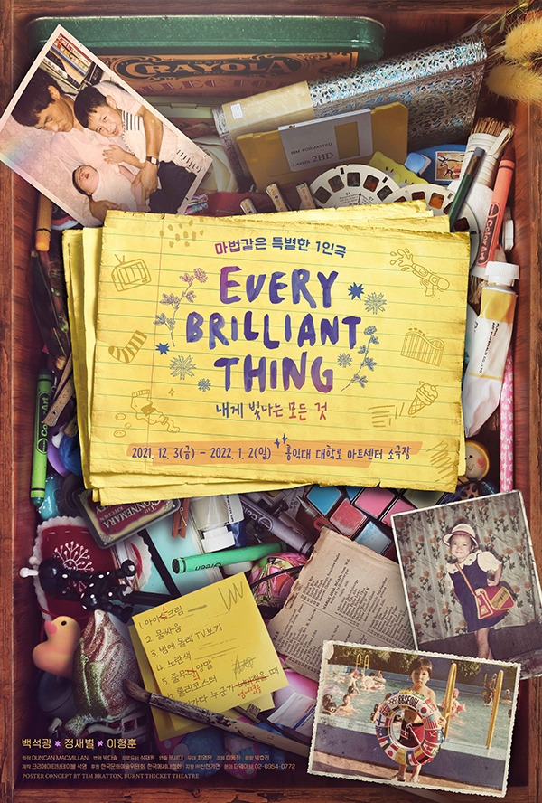 '내게 빛나는 모든 것 (Every Brilliant Thing)'이라는 연극이에요. 던칸 맥밀런이 집필한 1인극인데요, 주인공이 자살 시도를 한 어머니를 위해 '세상의 아름다운 것들'을 적어 나가는 과정을 담고 있어요. 간결한 무대와 배우 한 명으로 이루어지지만, 관객과의 적극적인 소통을 통해 극의 이야기가 풍부해지고 완성되는 구조예요. 극에서 다루는 ‘인간의 고통과 희망’이 어떤 문화적 배경에서도 공감할 수 있는 본질적인 주제라고 생각하고 주제를 다루는 방식도 신선해서 추천드리고 싶어요.