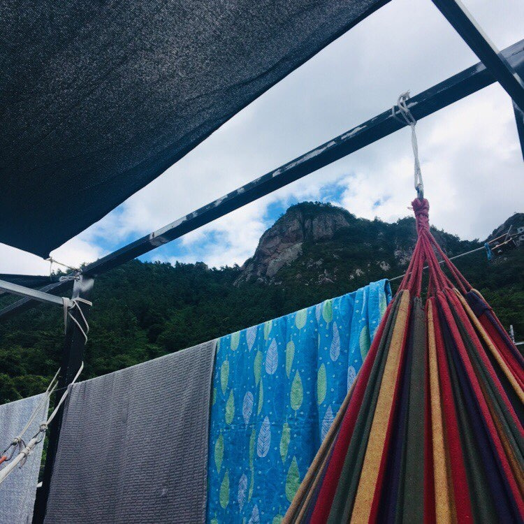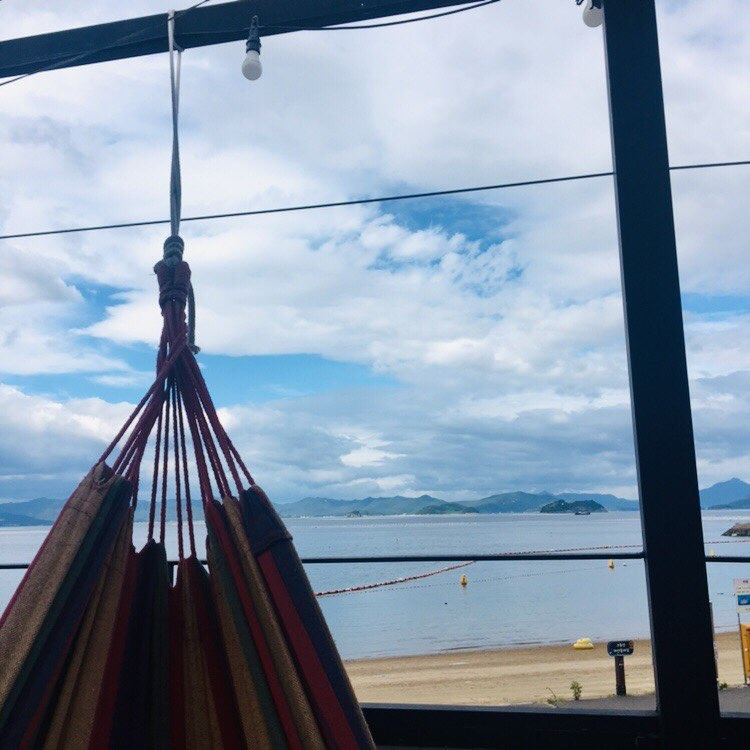나는 어디를 가든지 항상 책을 들고 다닌다. 이번에 사량도에 올 때는 부덴브로크 가의 사람들2를 비롯해 총 4권의 책을 챙겼다. 중간중간 비는 시간에 이곳저곳에서 책을 읽곤 했는데, 그중에서도 특히 해먹에 누워 책을 읽는 것을 가장 좋아했다. 카페 겸 부엌 옆 공간에는 파라솔을 꽂을 수 있는 나무로 된 벤치 2개가 있고 그 옆에 알록달록한 줄무늬가 인상적인 해먹이 3개 매달려있다. 그 앞에는 바다가, 뒤에는 산이 자리 잡고 있기 때문에 그날의 기분 혹은 개인의 취향에 따라 산과 바다 중에서 하나를 선택해 바라보며 누울 수 있다. 해먹에 누워 바다 혹은 산을 앞에 두고 재즈를 배경음악으로 책을 읽고 있으면, 모든 걱정근심이 사라지면서 평온한 행복에 도달할 수 있었다.