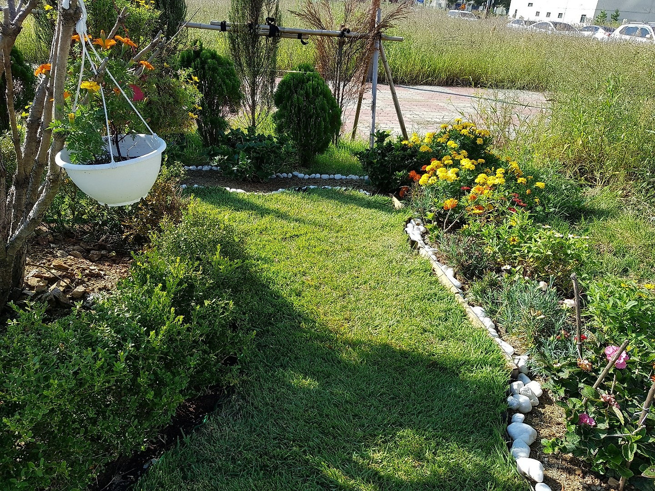 2018년 첫 해 마당 모양. 반송을 심었는데 죽어 꽃나무 걸이를 했고. 잔디도 열심히 자라는 중이었다.