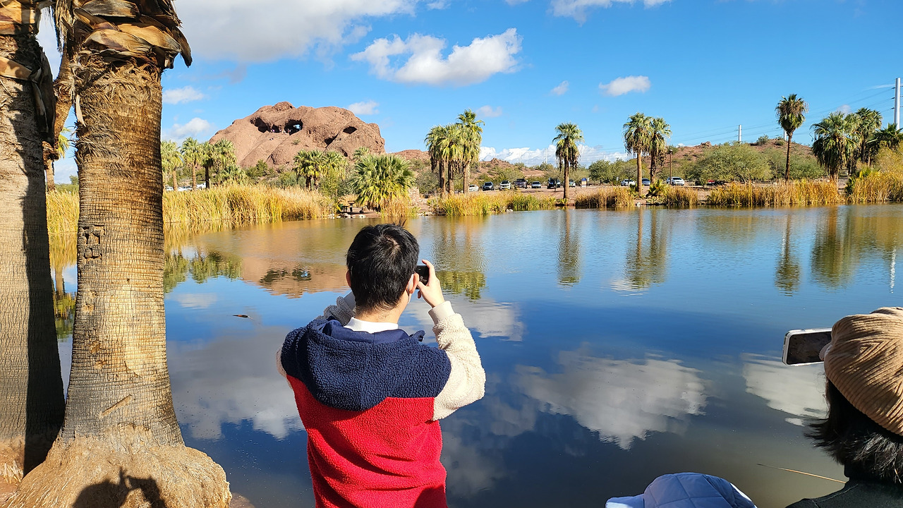 구멍 뚫린 바위에 오르고 나서 드넓은 평지를 바라보니 오아시스가 보였다. 일 년 내내 200ml의 비가 온다는 피닉스에 파란 하늘을 오롯이 담고 있는 호수를 보니 마음이 저절로 시원했다. 아이들과 발길을 돌려 오아시스를 찾아갔다. 낚시꾼이 낚싯대를 드리우고 앉아 있는 모습이 보였다. 작은 새들이 호수에 두둥실 떠다니며 자맥질하고 따스한 바람이 솔솔 불었다. 죽었던 불사조가 누워있다 떨쳐 일어설 곳이었다. 너무 아름답고 편안했다.