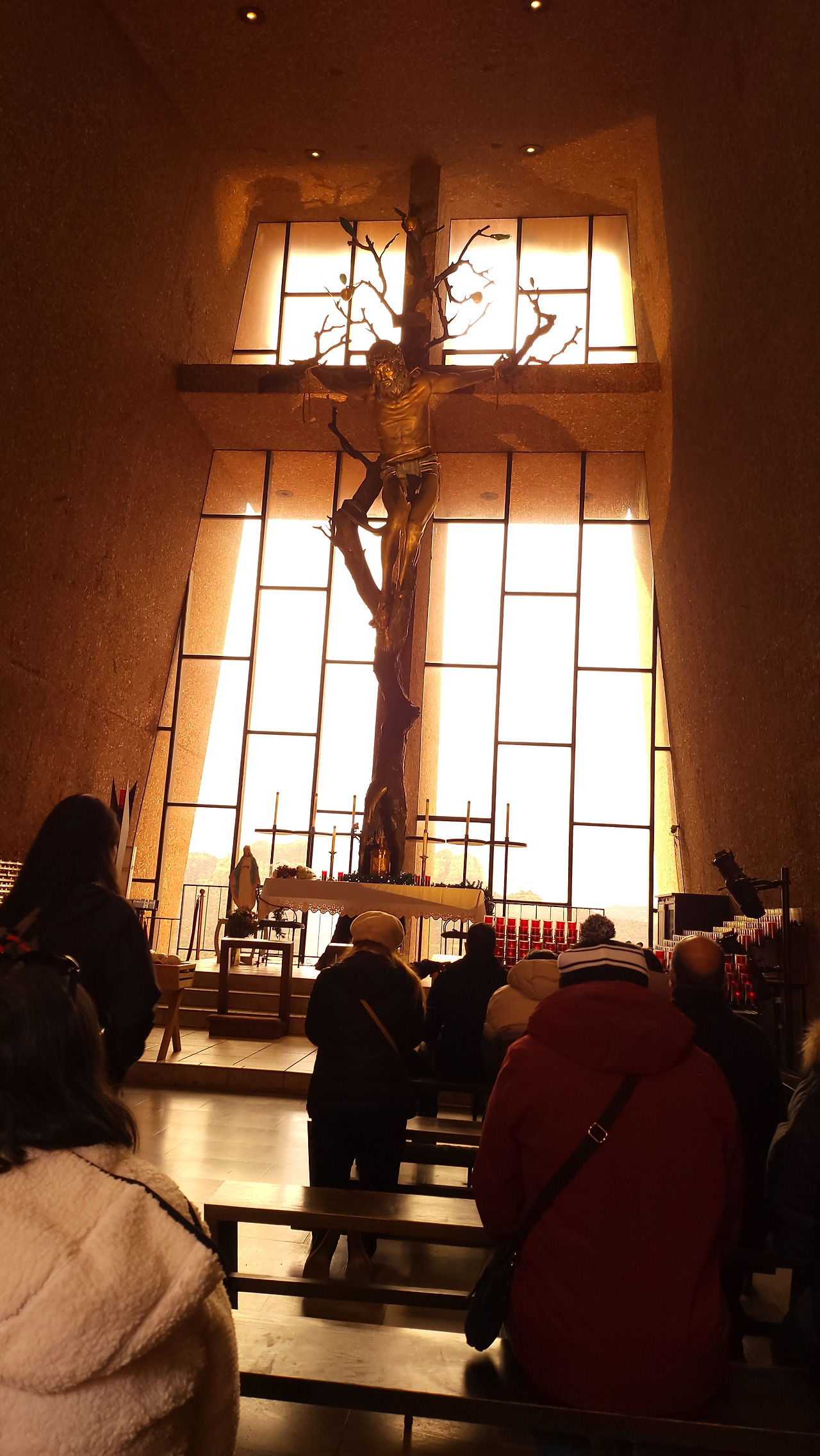홀리 크로스 채플 (Chapel of Holy Cross)은 사람들로 북적였다. 붉은 바위에 기다랗게 세운 성당은 아름다웠다. 바위산 아래서 보면 길쭉한 직사각형 구조물이 바위와 어우러져 특색 있는 모습이었지만 워낙 주변 바위들의 형태와 색상이 독보적이어서 성당 자체의 느낌은 크지 않았다. 막상 성당 입구에 올라 성당을 보니 성당이라 보기 어려울 만큼 규모가 작았다. 50명이나 들어갈까 싶은 작은 공간이었지만 성당에 들어서니 작은 탄성이 나왔다. 십자가에 매달린 예수님 뒤로 한없이 넓고 깊은 빛들이 쏟아져 들어왔기 때문이다. 어느 성당이던 아이들이 없이 들어가면 잠시 앉아 아이들을 위한 기도를 하였건만 아이들과 함께 여행을 오니 남편을 위한 기도를 했다. 가족이란 부재를 통해 사랑을 깨닫기도 한다.