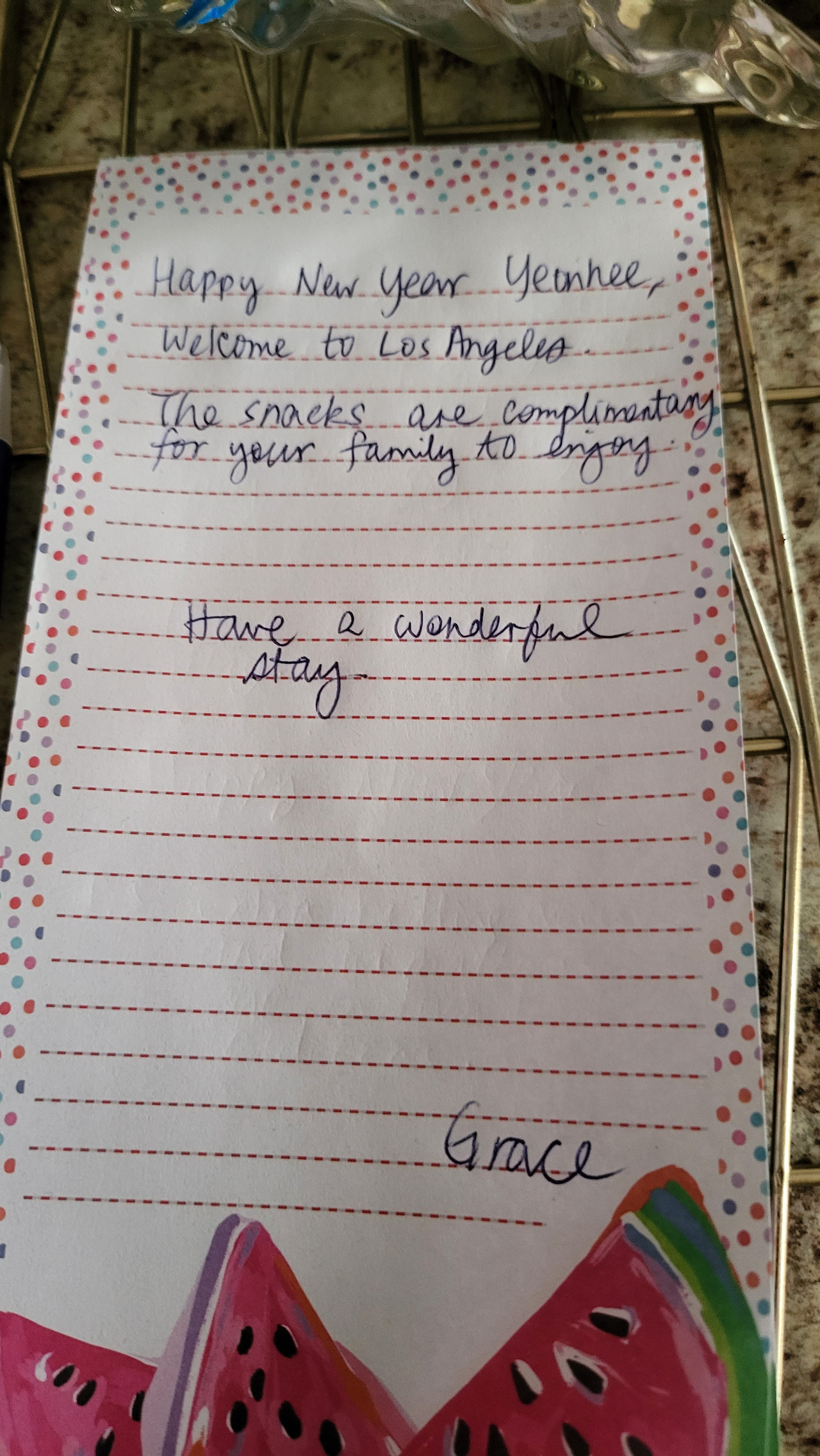 숙소는 로스앤젤레스의 외곽에 위치한 조용한 곳이었다. 내가 예약한 숙소였지만 아이들이 도착하자마자 좋다 하니 마음이 놓였다. 집주인 그레이스가 환영의 쿠키와 음료수, 초콜릿, 메모를 작성해 놓았는데 마음이 푸근해졌다. 소소한 배려를 보며 그 소소함을 배워야겠다 생각했다. 침대도 편안하고 거실도 주방도 있으니 며칠 호텔 생활로 답답했던 마음이 풀어졌다.