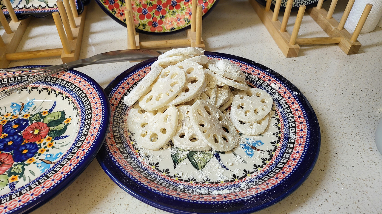 연근을 소금과 식초 넣고 살짝 데친 후 튀기니 아삭하고 맛나다
