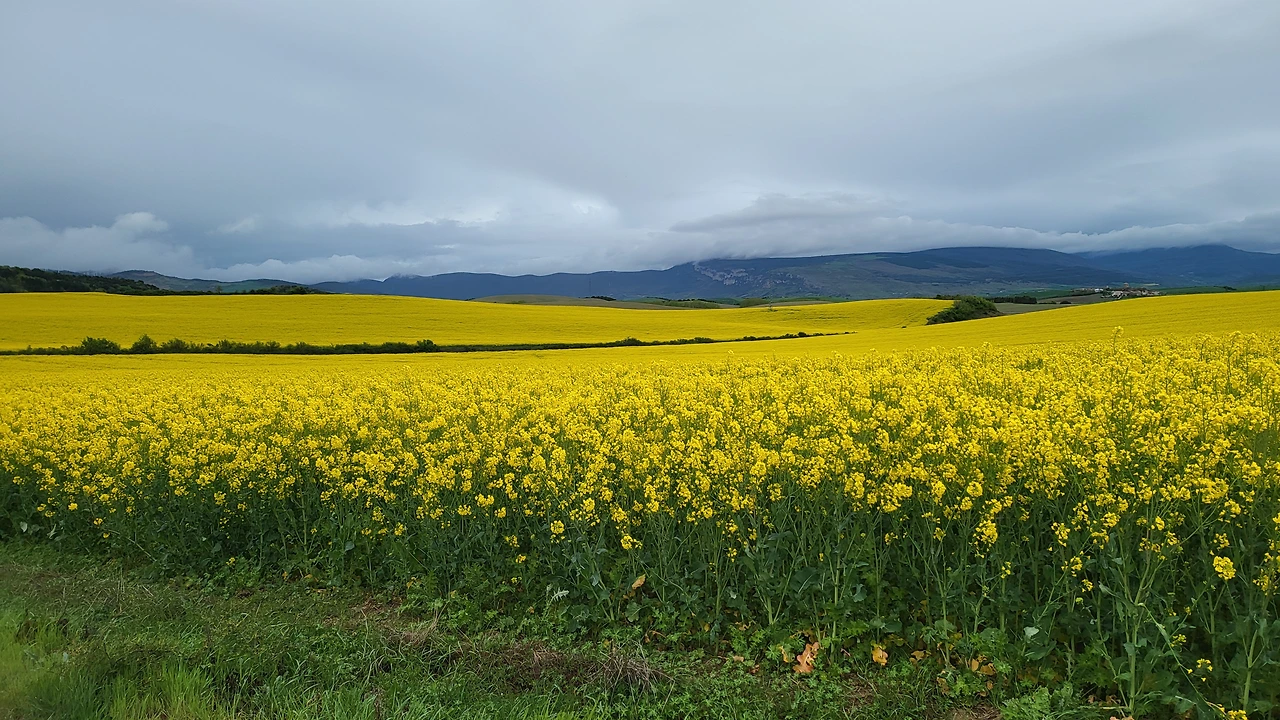 팜플로나를 지나 패르돈 언덕(용서의 언덕)을 오르는 완만한 길엔 수많은 순례객이 길을 걸었다. 길이 너무 아름다웠다. 물감을 도화지에 막 풀어놓은 듯했다. 유채밭과 밀밭이 조각 잇기를 하듯 구릉을 메웠다.