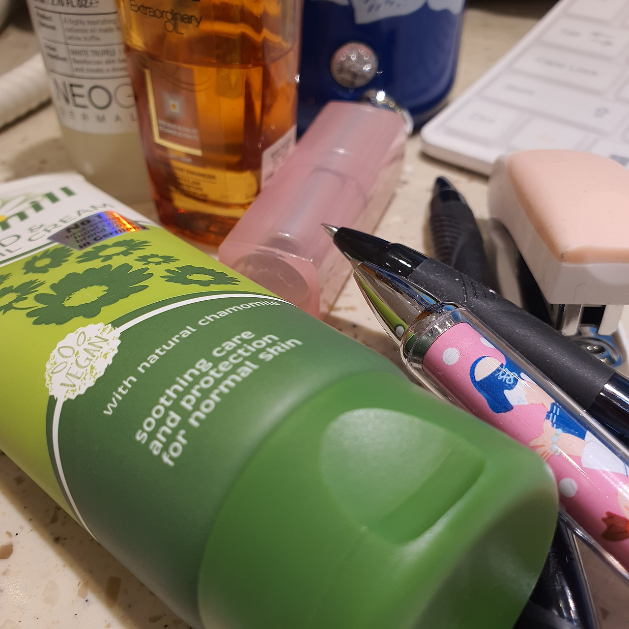 사무실의 내 책상. 소비를 줄였지만 여전히 많은 물건들.